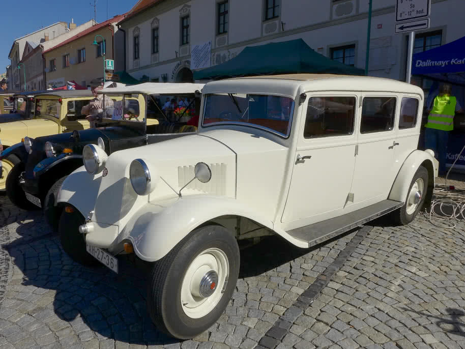 Bílá šestisedadlová Tatra 52 (když si nebudete jisti, zda jde o třicítku nebo dvaapadesátku, podívejte se na brzdy – hydraulické brzdy měla až Tatra 52).