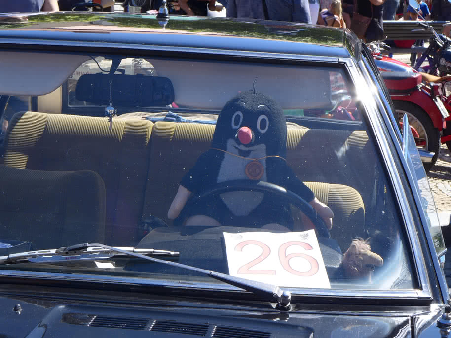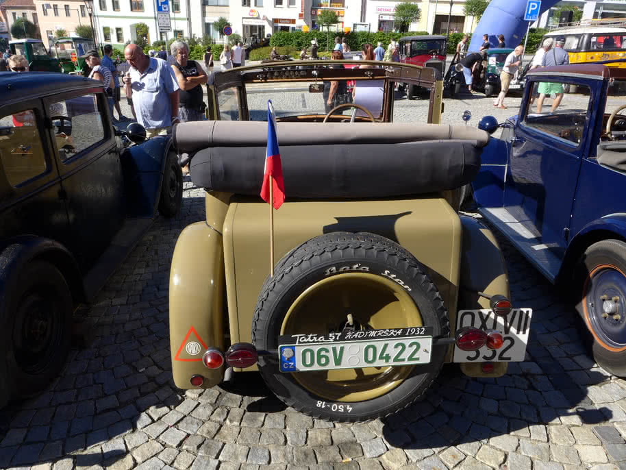 Obdrželi jsme startovní číslo 152 a fotograf pořídil zdařilou fotečku celé naší posádky na diplom. Protekční startovní číslo 130 pro naši Tatru se však nacházelo u příslušníka na horním konci náměstí. O důvod víc jet příště horem ;) .