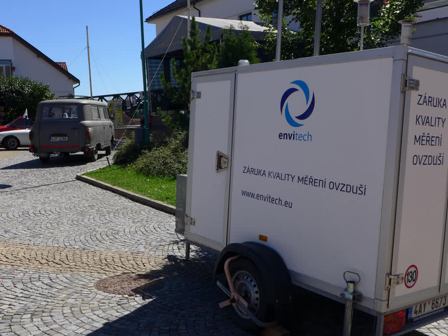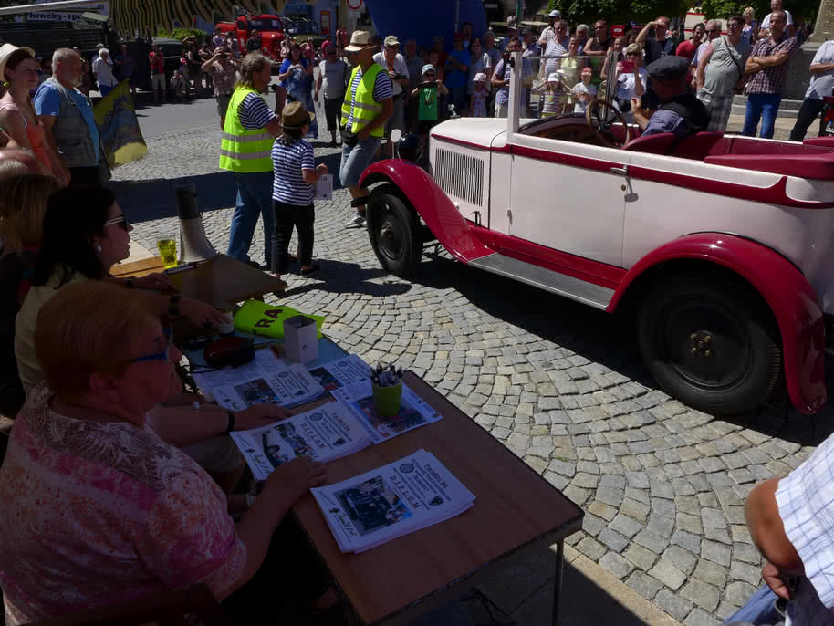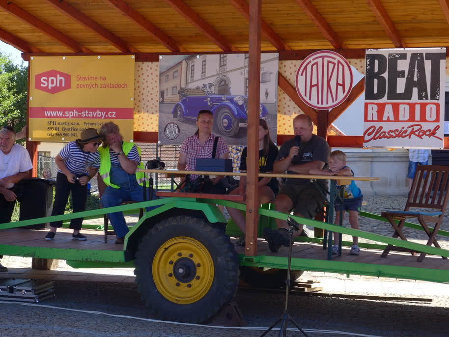 František každou posádku představil, předal pamětní diplom, popřál šťastnou cestu a odmávl startovním praporem s erbem města Bystřice. Trochu zlobil mikrofon – zvuk byl jakoby přebuzený. Při ranních testech ale bylo vše v pořádku. Osobně bych tipoval příliš zarušené pásmo 800MHz (LTE) – v tomto pásmu starší bezdrátové mikrofony pracují a nyní se perou s většinou mobilních telefonů. Podle svých zkušeností s podobnými efekty v pásmu 2.4GHz na modelářských akcích bych tipoval, že ani v tomto pásmu by mikrofon nepracoval zcela bezvýpadkově.
