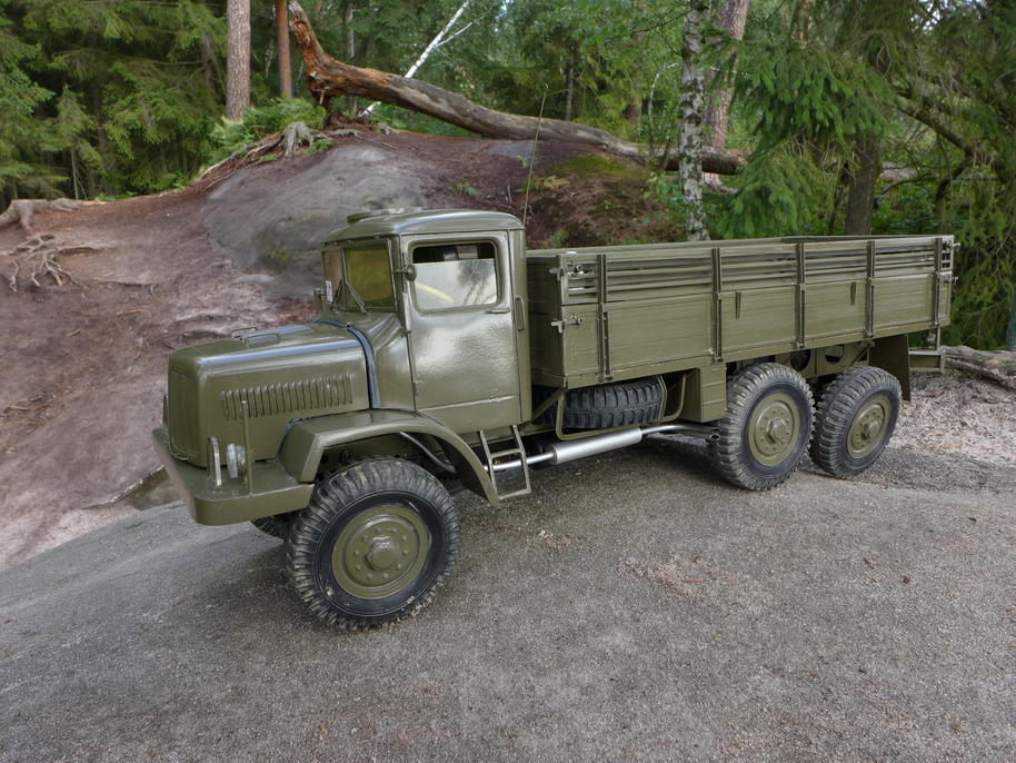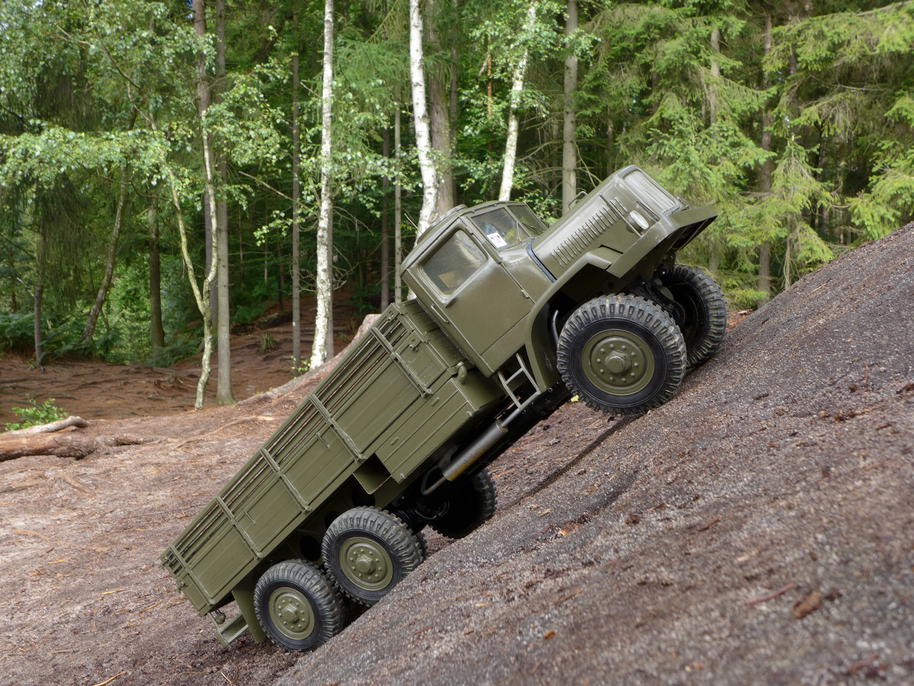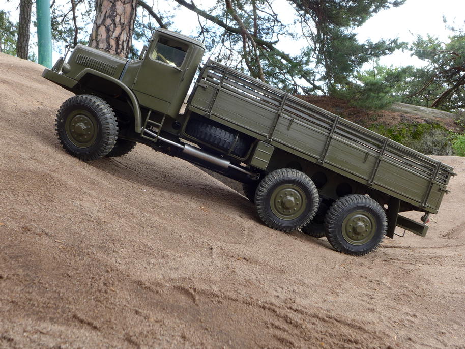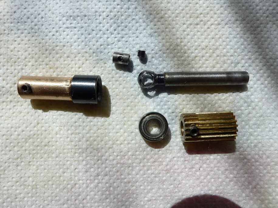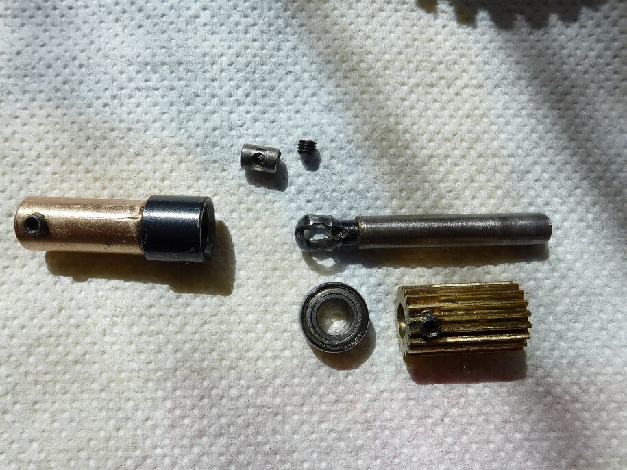 Po demontáži kloubu je patrné značné opotřebení vlivem nesprávné geometrie pohonu. K tomu zřejmě značně přispělo občasné vysouvání hřídele z převodovky, než jsem tomu zamezil zajištěním vnějšího ložiska. Nyní k tomu ještě přibylo uchycení předního konce převodovky do přední rozvodovky (ve skutečnosti to je podobně, jen převodovka T128 je proti modelové převodovce delší a je přišroubována k rozvodovce v prostoru mezi jejím zadním koncem a polonápravou). Pokud se obě úpravy osvědčí, budou nastříkány černou barvou, aby nerušily vzhled modelu.