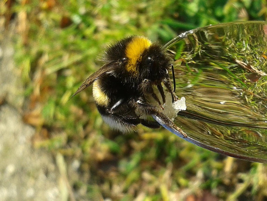 Odměnou za donesené krmení nám byla půlhodinová podívaná, jak čmelák svým dlouhým sosáčkem olizuje medové krystalky. Když se dostatečně posilnil, začal pobíhat po zemi a zkoušel vzlétnout. Udělal pár krátkých pokusů až se mu nakonec start podařil. S mezipřistáním na květu sedmikrásky odletěl zpátky někam k malinám.