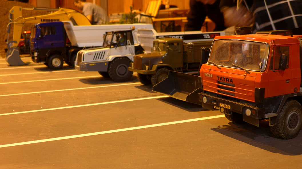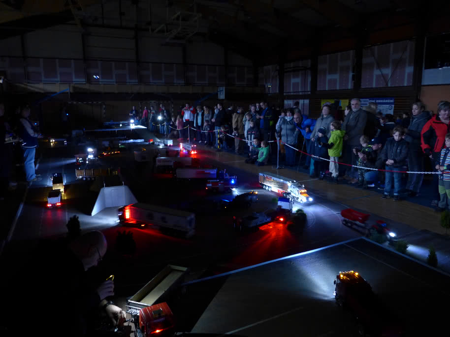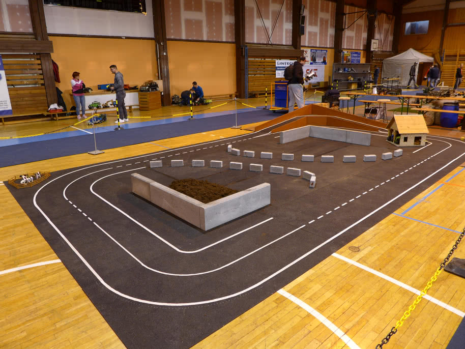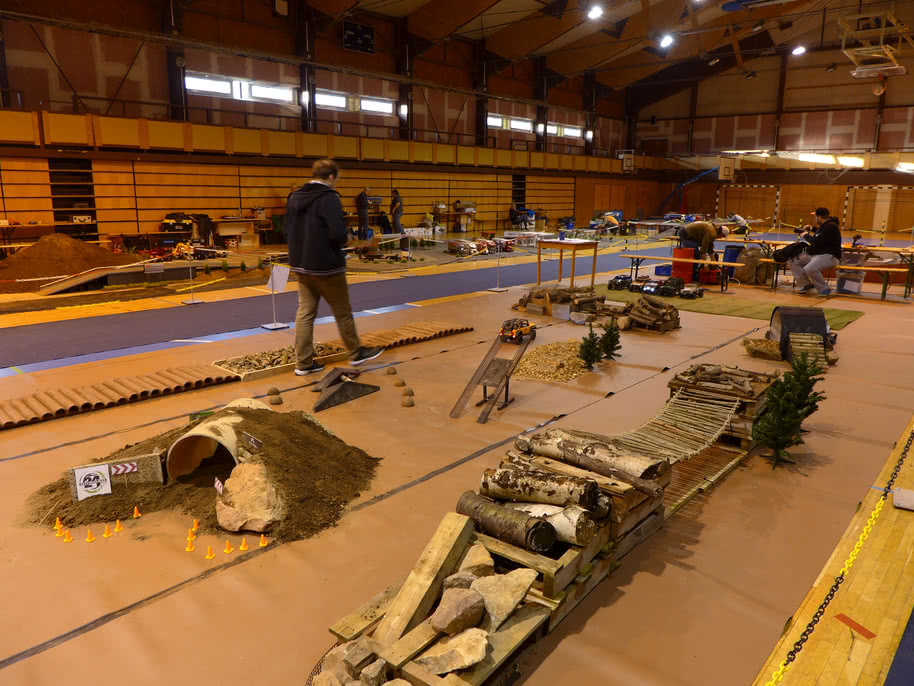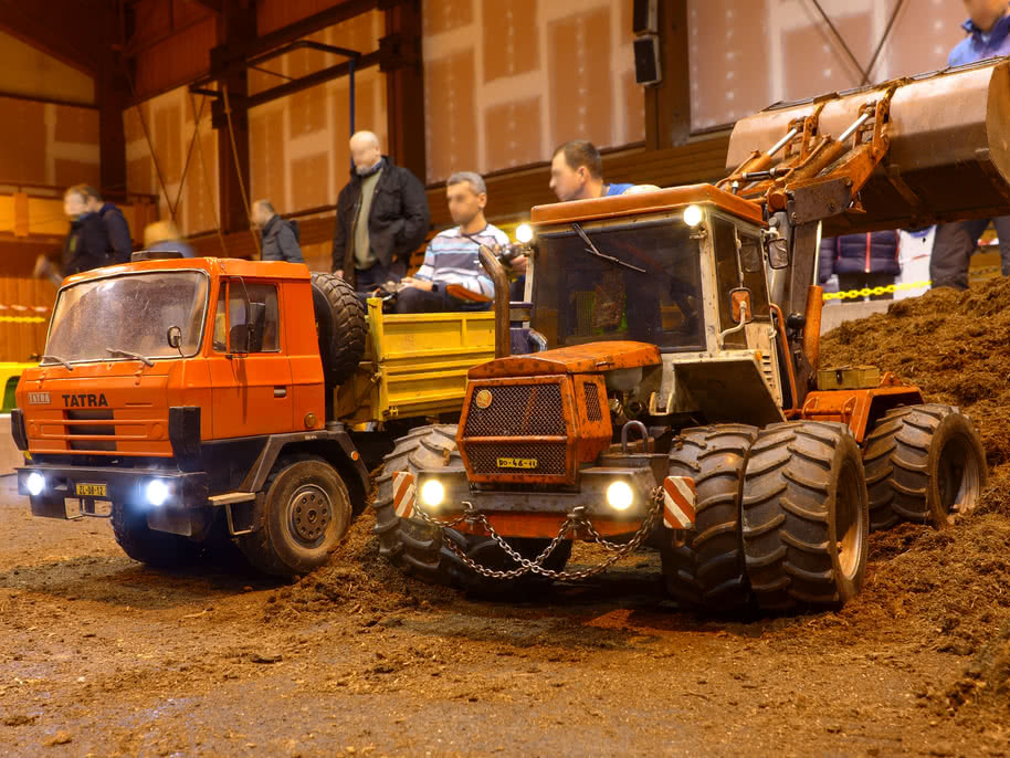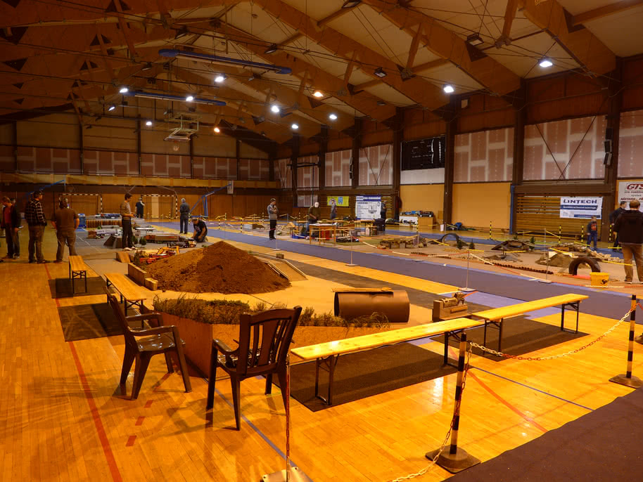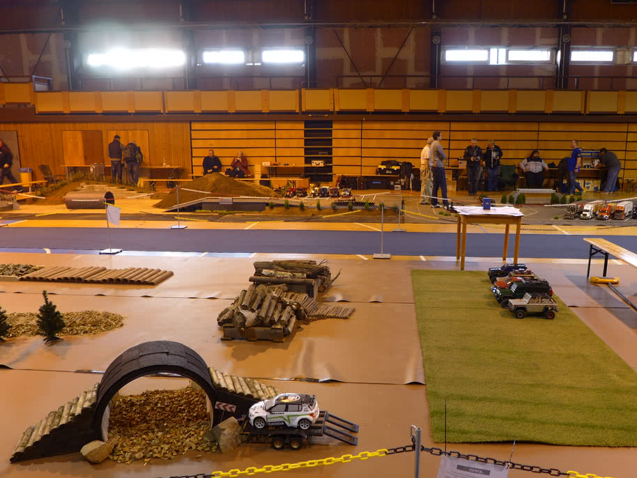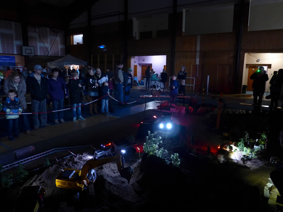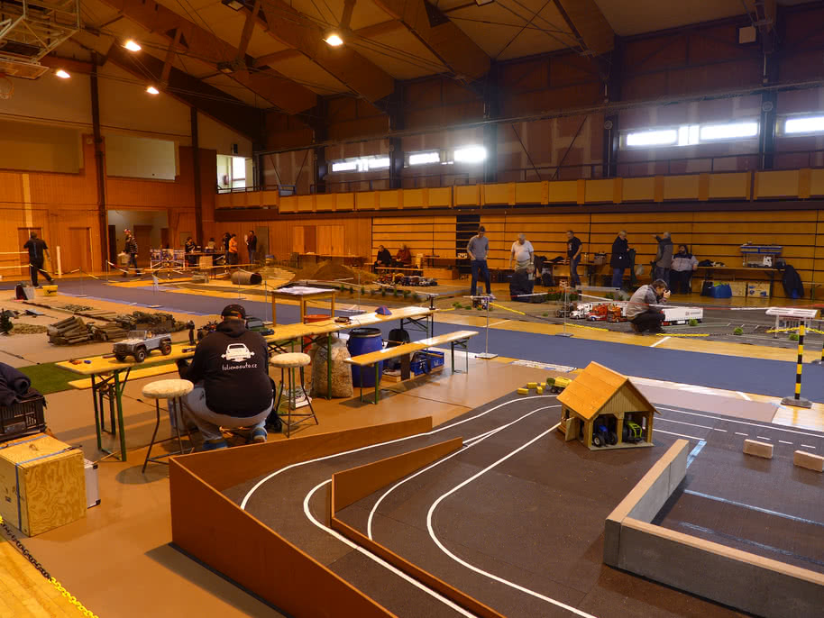 Od ranních hodin probíhala příprava modelových prostředí v tělocvičně Sokolovny. Téměř celá jedna polovina haly byla letos věnována kamionům a stavební technice. Oproti minulým ročníkům byl redukován prostor pro letadla, neboť tradičně zastoupené velké modely stejně v hale létat nemohou. Druhou polovinu si rozdělili zemědělci a expediční off-roady. U zemědělců se mi velmi líbil nápad s vyvýšenou zatáčkou. Když jsem tam během dne jel se stotřicítkou, musel jsem využít každý milimetr silnice, abych zatáčku vytočil bez couvání.