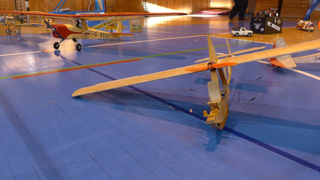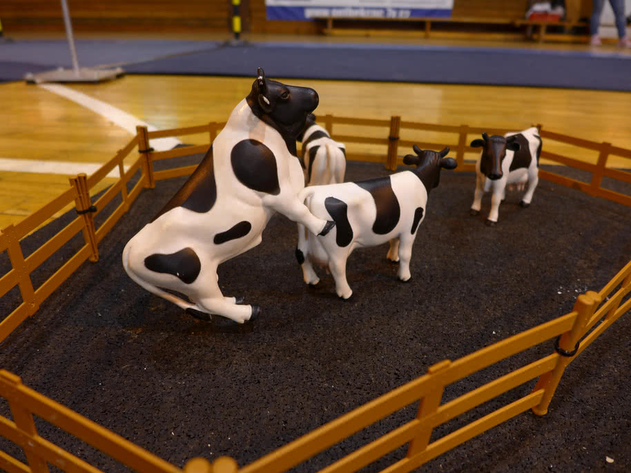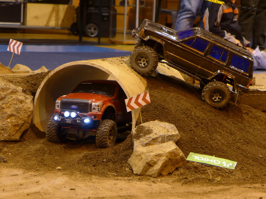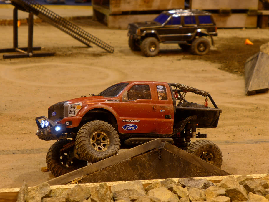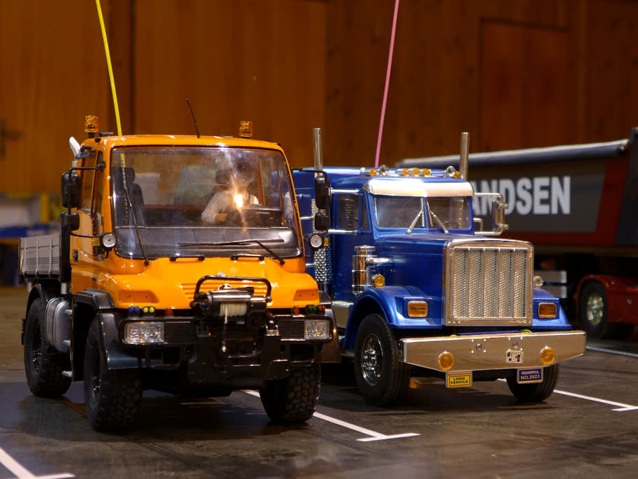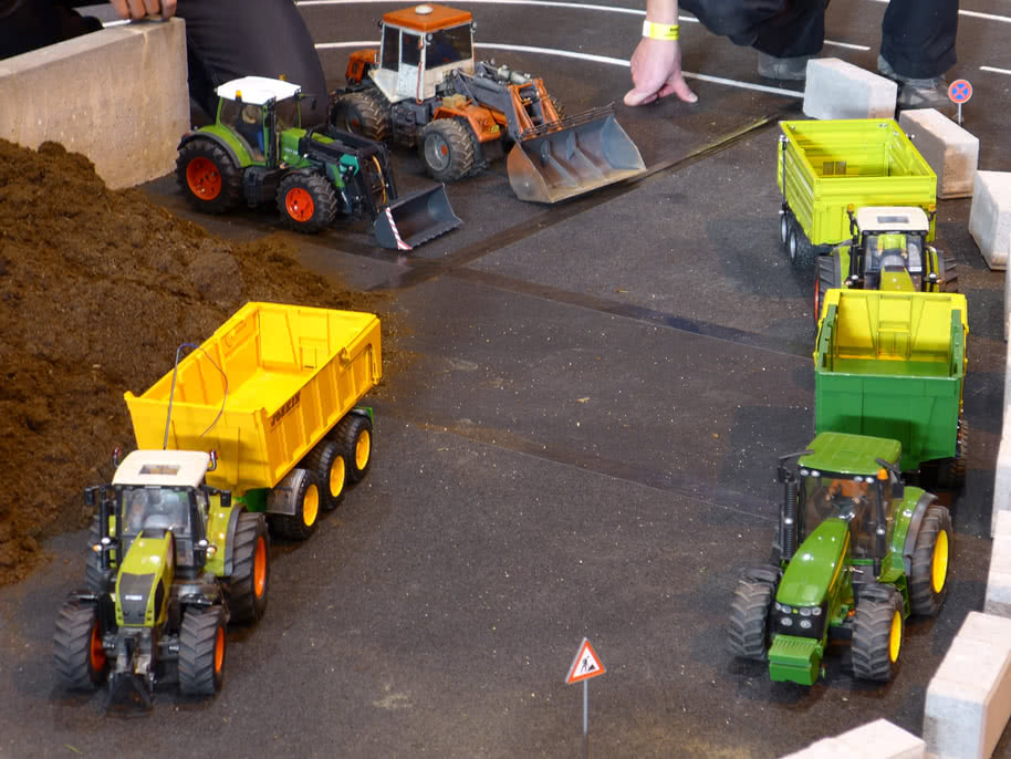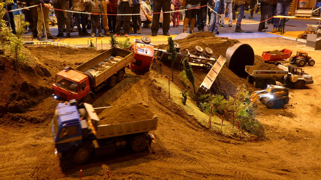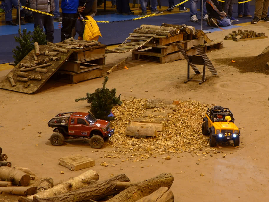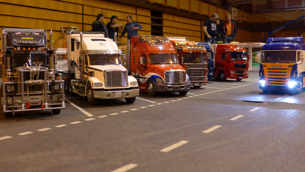 Od ranních hodin probíhala příprava modelových prostředí v tělocvičně Sokolovny. Téměř celá jedna polovina haly byla letos věnována kamionům a stavební technice. Oproti minulým ročníkům byl redukován prostor pro letadla, neboť tradičně zastoupené velké modely stejně v hale létat nemohou. Druhou polovinu si rozdělili zemědělci a expediční off-roady. U zemědělců se mi velmi líbil nápad s vyvýšenou zatáčkou. Když jsem tam během dne jel se stotřicítkou, musel jsem využít každý milimetr silnice, abych zatáčku vytočil bez couvání.