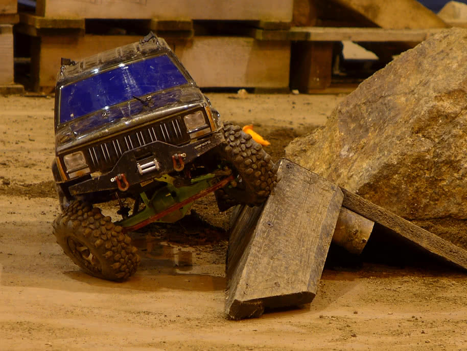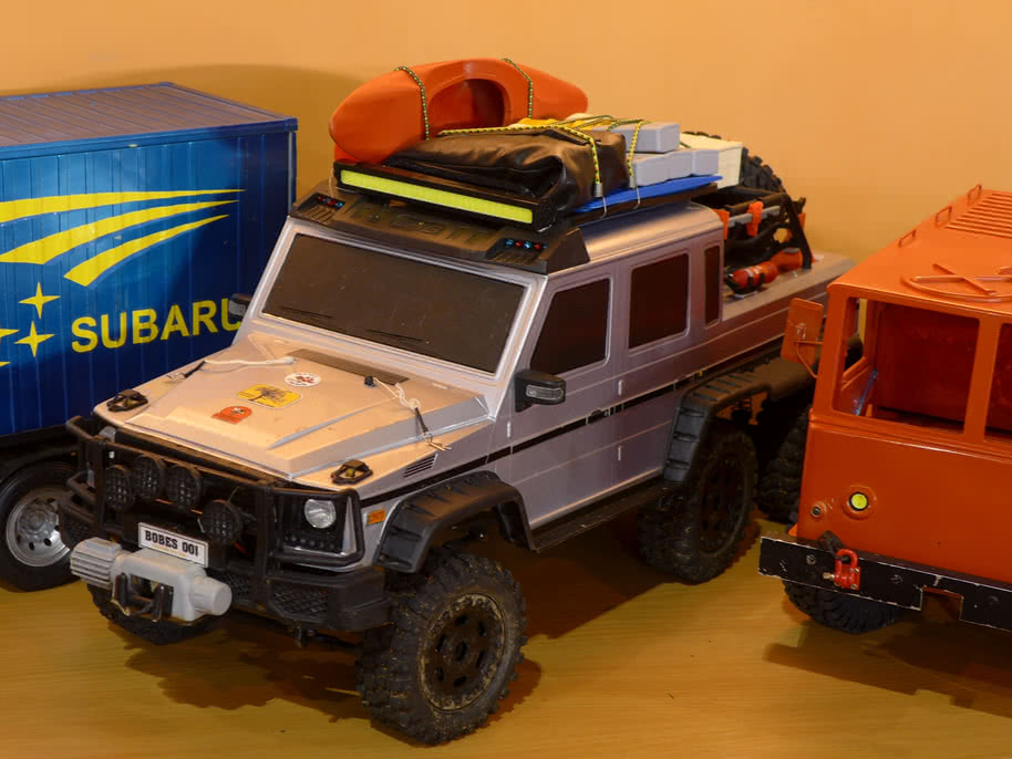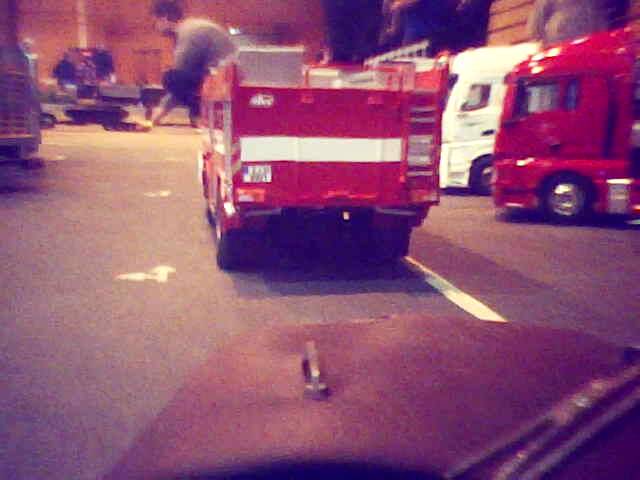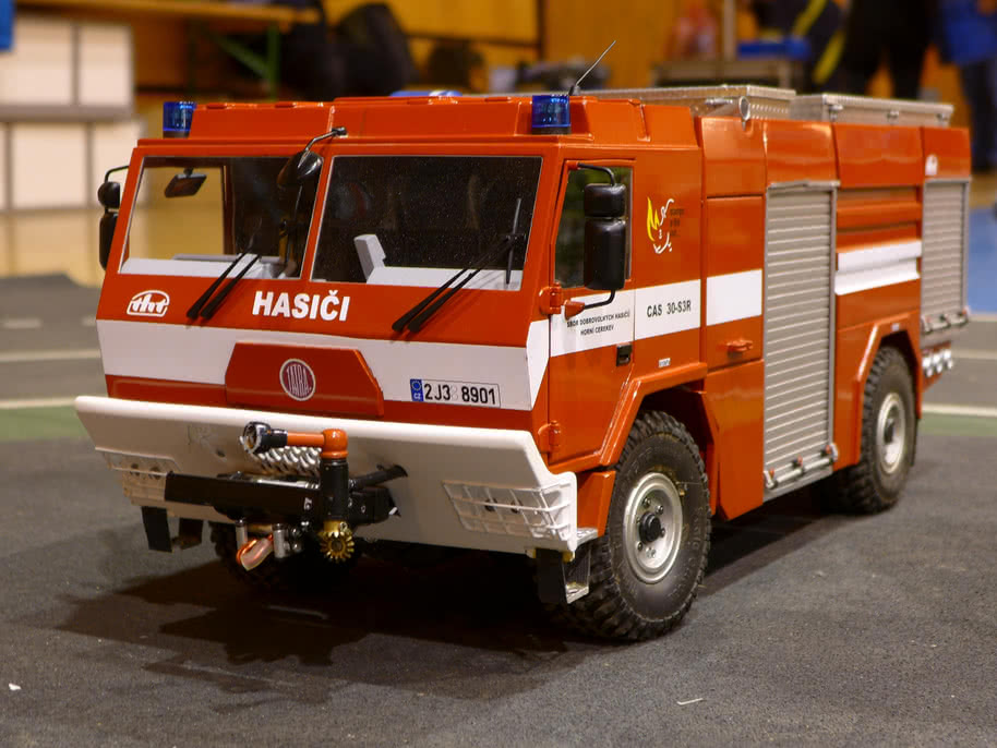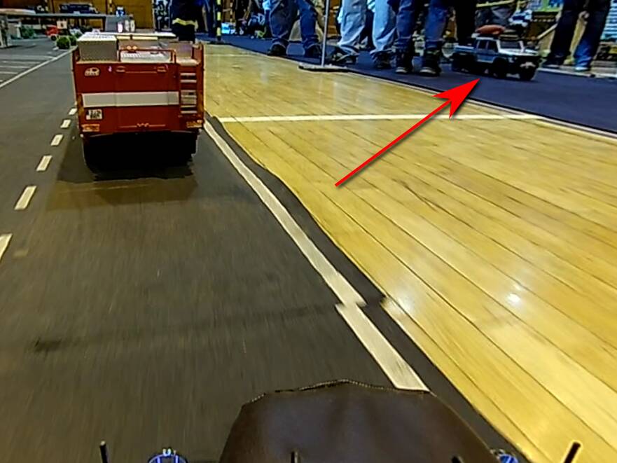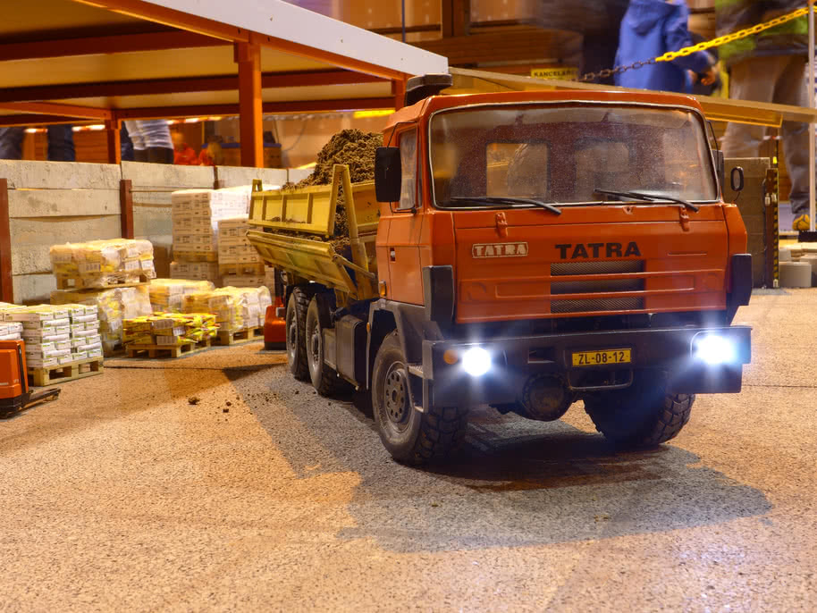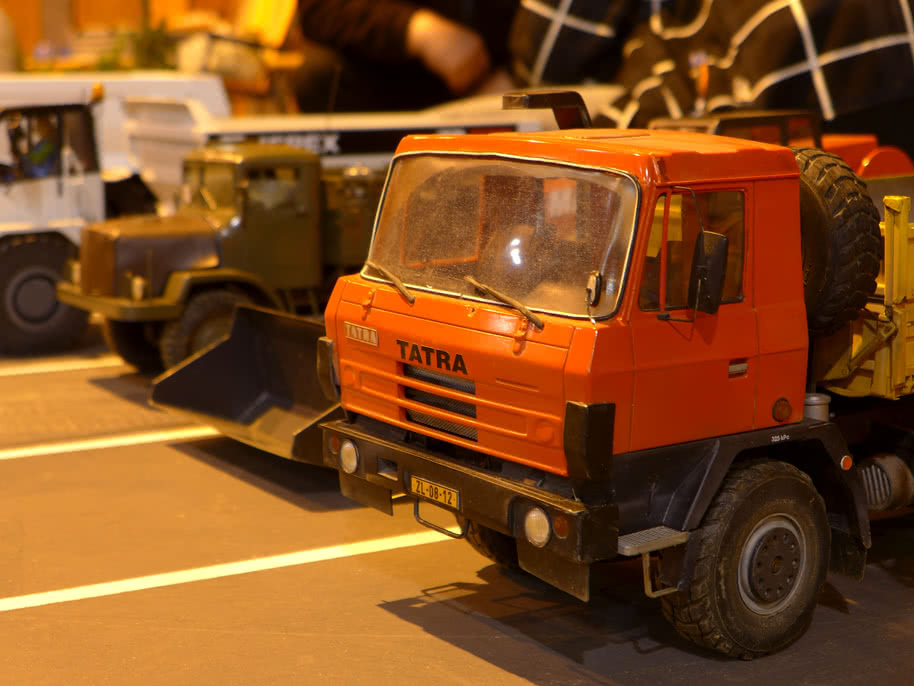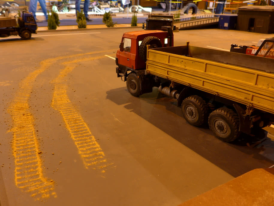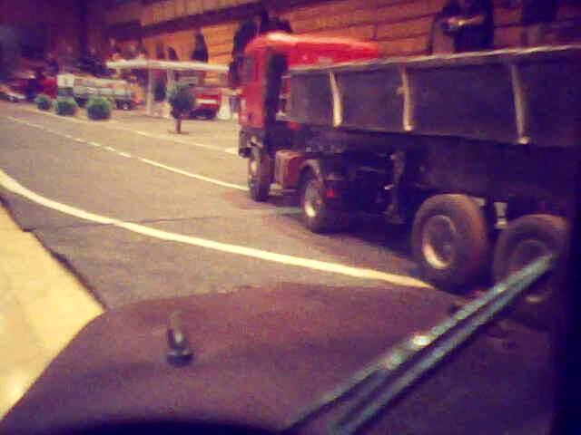 Ještě než se rozjela většina modelů, projel jsem si s T130 celou modelovou plochu, abych si ověřil dosah signálu. Kupodivu byl všude příjem signálu dobrý, během dne Tatra zvládala v hale s množstvím vysílačů vzdálenost přes 5m. Zazlobila jen v jednom okamžiku ... později se ukázalo, že se nevědomky rušíme s kolegou ze sekce expedičních off-roadů, konkrétně se šestikolovým Leguánem, taktéž na 40MHz a kanálu 51 ;). Tatra tuto situaci zachytila na videu. Ostatně tento šestikolový "Leguán" byl zajímavý kousek. Má kompletně vyměněné vnitřnosti, neboť dle slov svého majitele – převodovka vydržela jen pár hodin, neboť má zcela nevhodně dimenzované převody. Zajímalo by mě, v jaké situaci došlo k oholení převodových koleček, abych se toho mohl případně vyvarovat. Mně se nic podobného zatím nepodařilo ... možná proto, že se svou čtyřkolovou variantou jezdím jako se skutečným autem ;) .