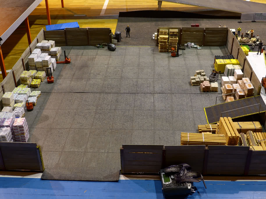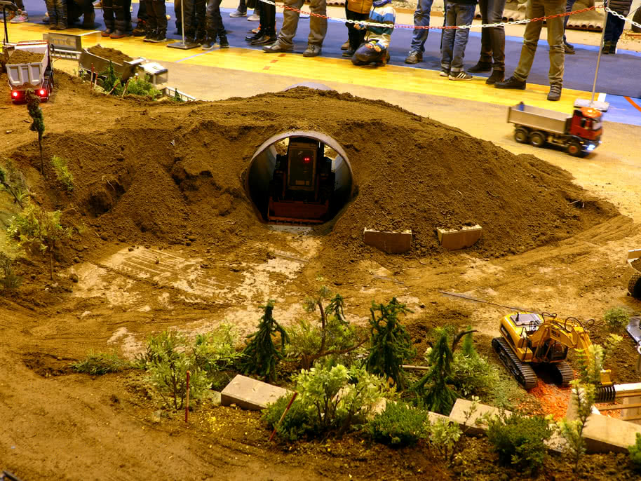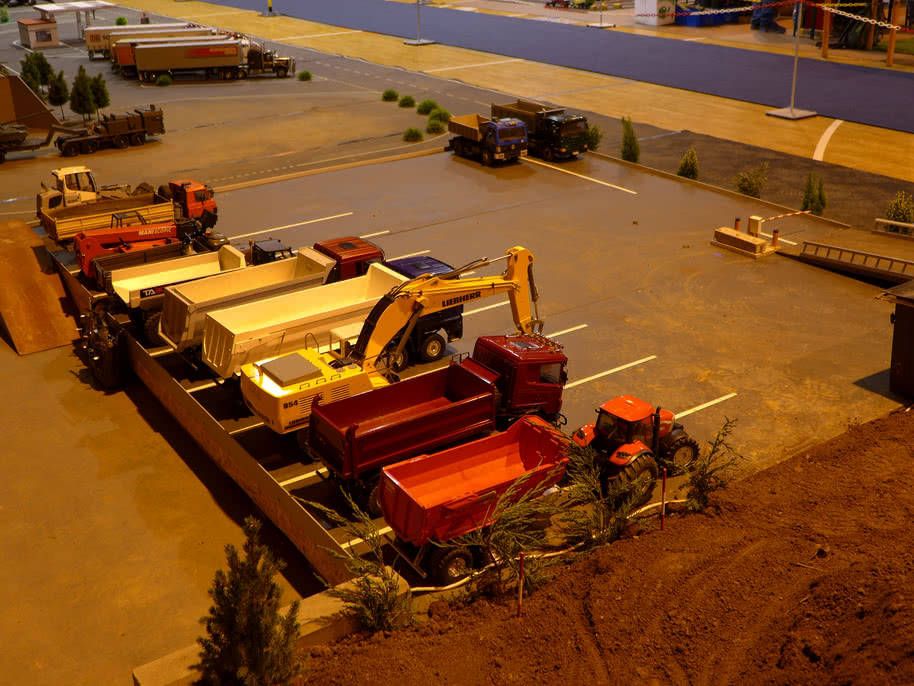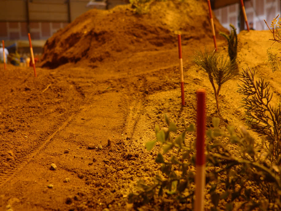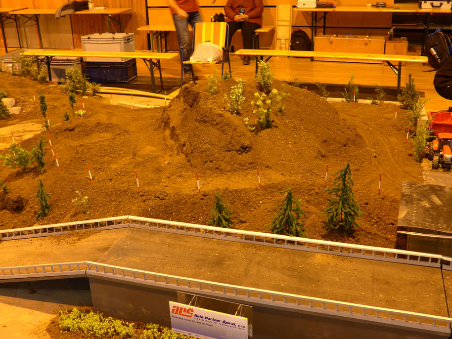 Hned vedle kopice zeminy bylo vyvýšené parkoviště pro stavební techniku, což byl naprosto skvostný nápad. Za parkoviště šly schovat vysílačky, nikdo neběhal mezi modely a parkoviště plynule navazovalo na terénní část, což umožňovalo pohodlný odvoz zeminy. Před parkovištěm směrem k divákům byl dokonce pruh živé a pečlivě zalité zeleně.