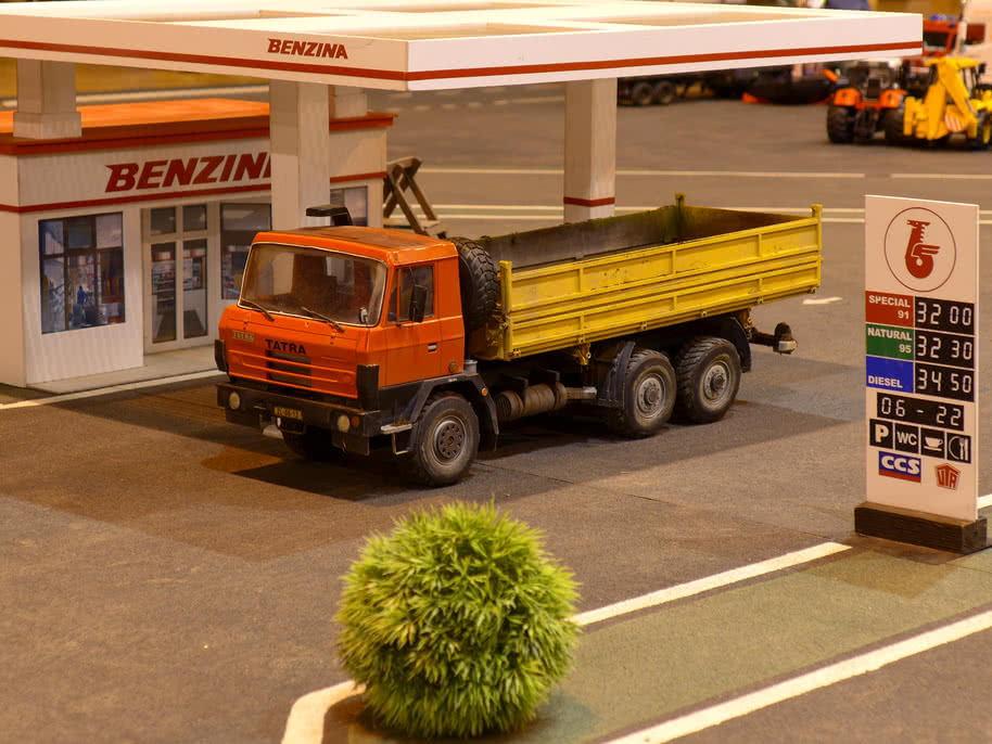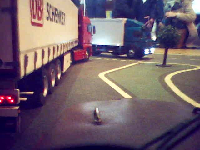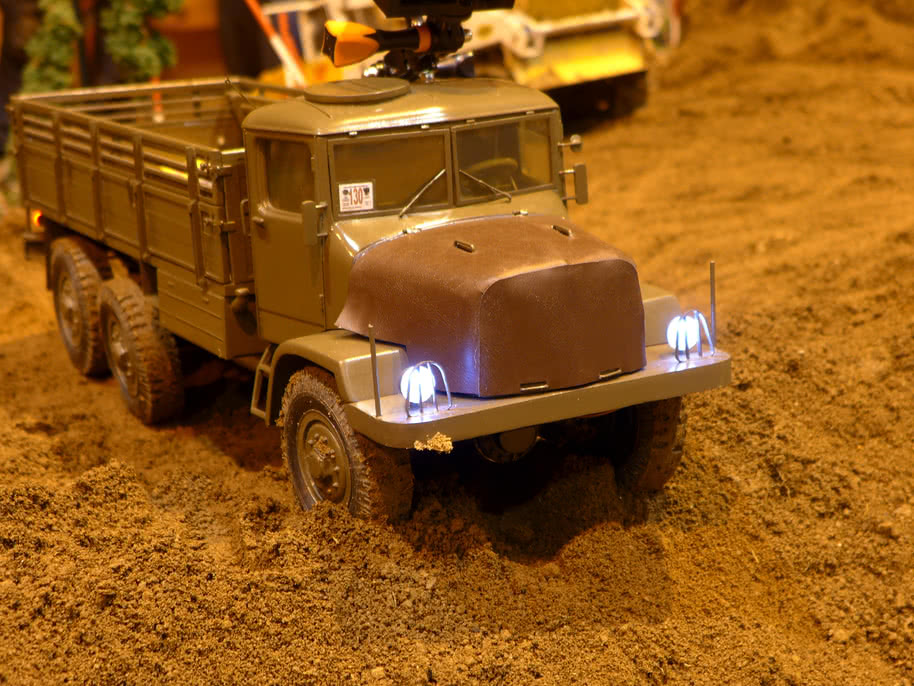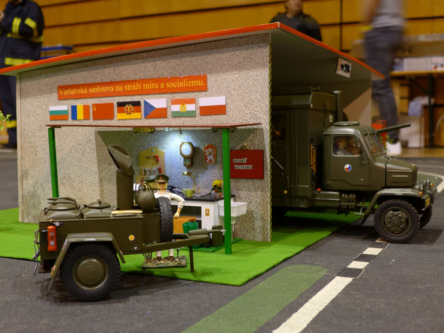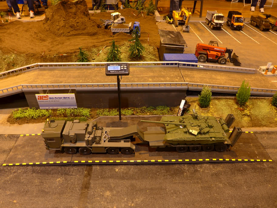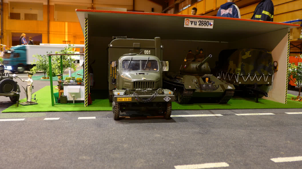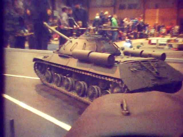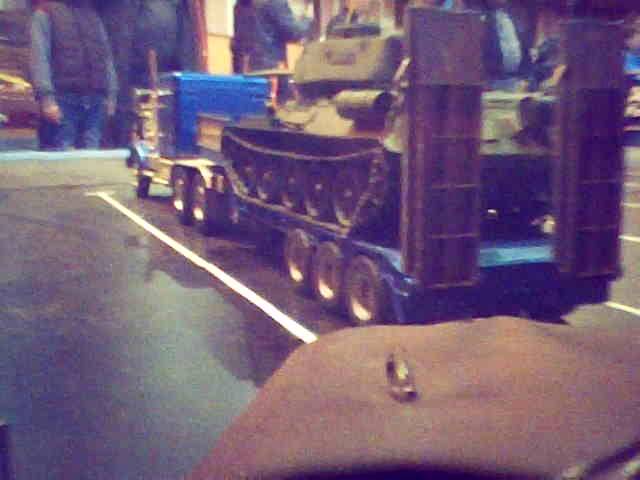 Tankisté zde měli dvě soupravy – tahač FAUN (?) s ruským strojem T80 a návěsový tahač Scania vozil krásný ručně stavěný model IS-3. Podobnou soupravu jsme před několika lety viděli na vlastní oči cestou ze Slovenska přes hraniční přechod Bumbálka. Tam Volvo táhlo T72! V prudkém stoupání tam asi nic většího než jedničku tahač zařazenu neměl. Já jsem soupravu následoval na malou dvojku nebo trojku, podle aktuálního stoupání. Běžná auta za námi se střídavě přibližovala a vzdalovala, protože odpovídající kvalt jejich řidiči v převodovkách vylosovat nedokázali :) .