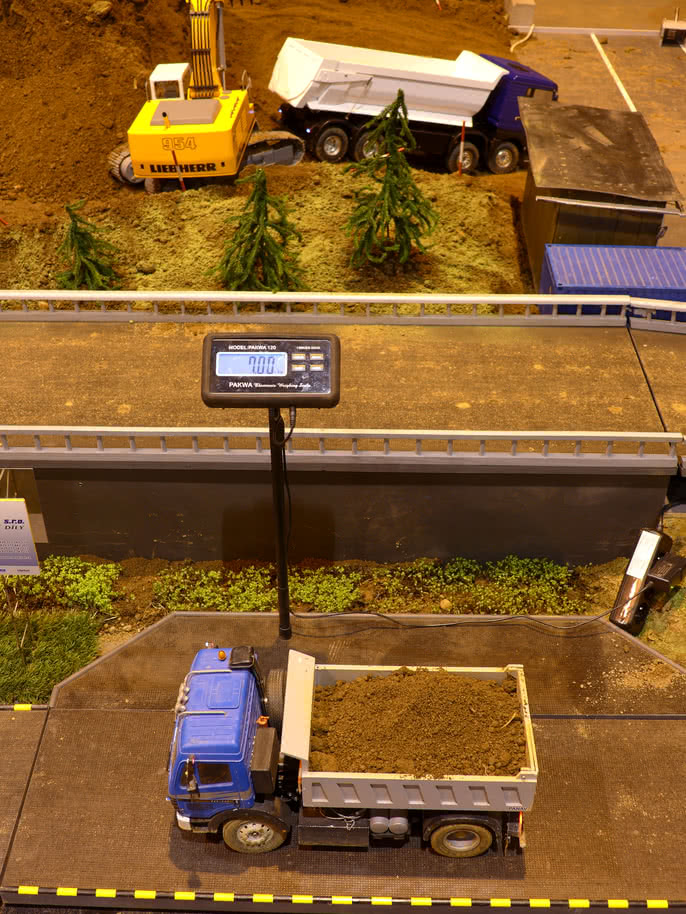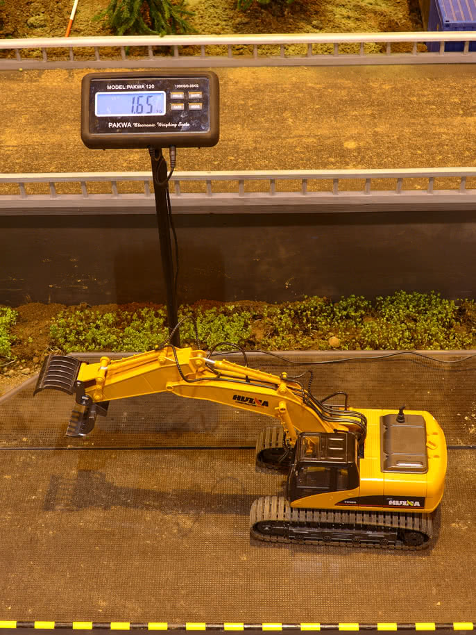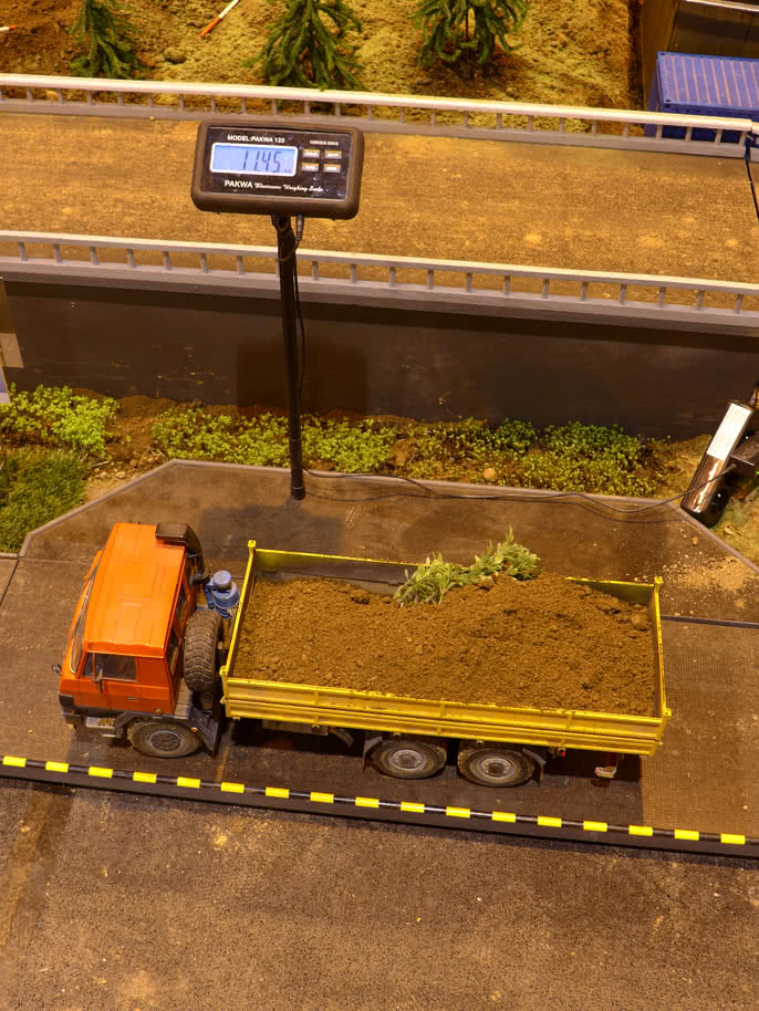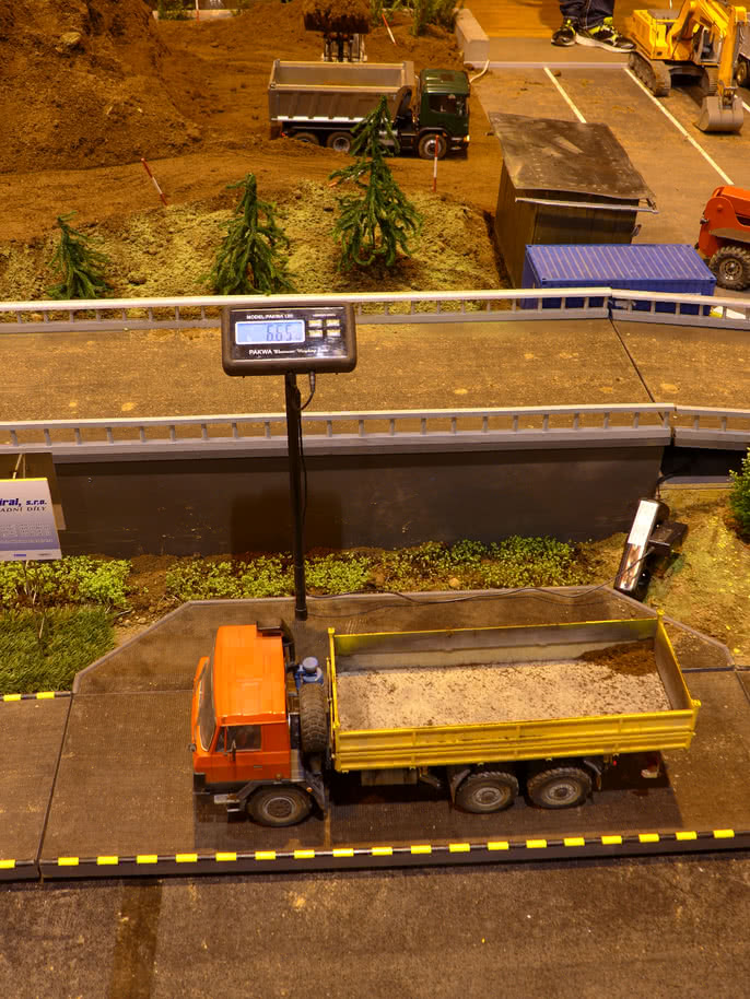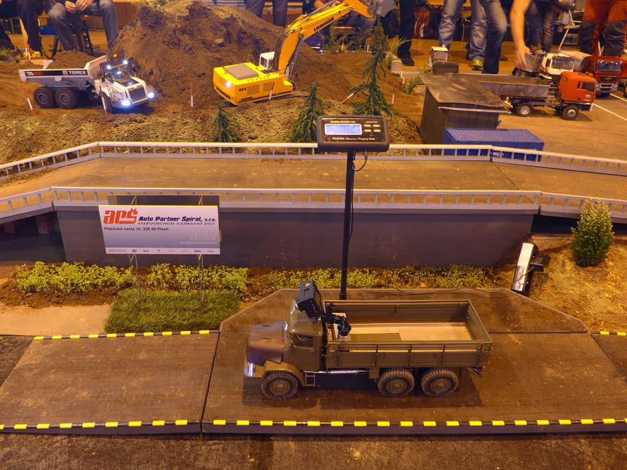 Před parkovištěm také byla velká váha. Prázdná Agrovka má 6.65 kg (v přepočtu měřítkem je to přes 16 tun). Trochu naložená umí mít i přes 11kg (28 tun). Majklův Mercedes naložen na celkových 7.0 kg (17 tun). Stotřicítka má pohotovostní hmotnost 3.7 kg, s nosníkem a kamerou 3.9 kg a se selfie tyčí rovné 4 kg.
