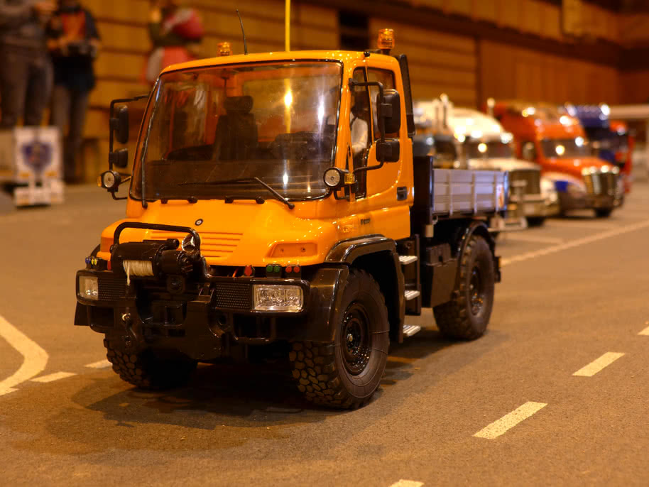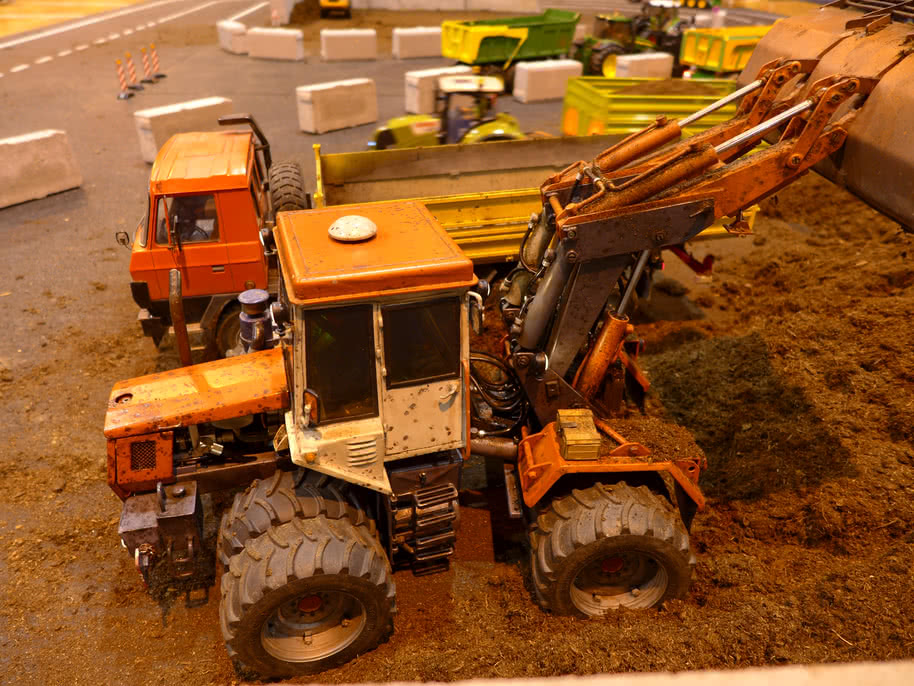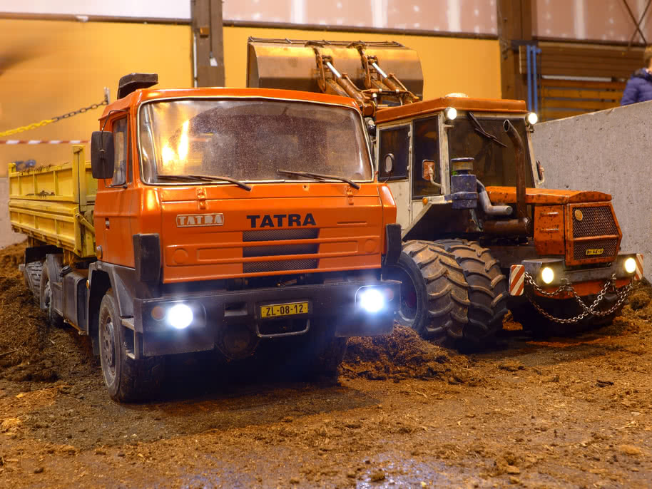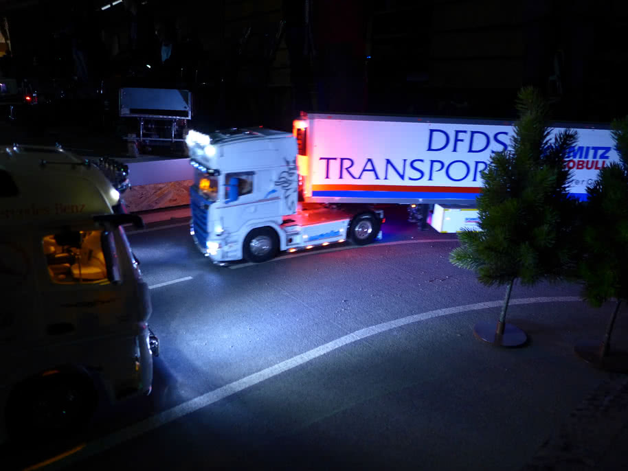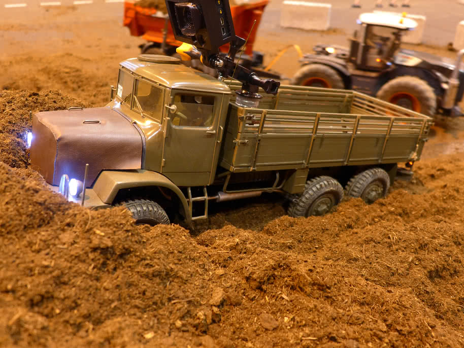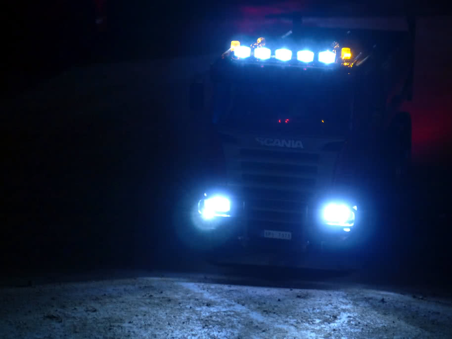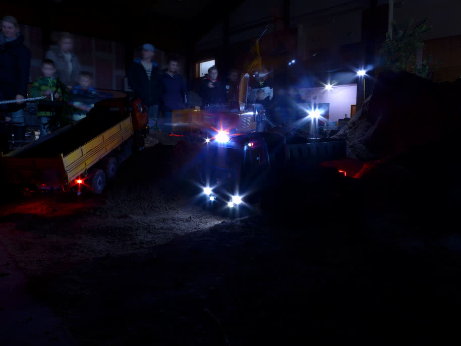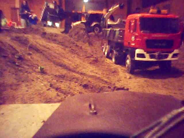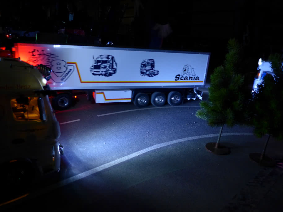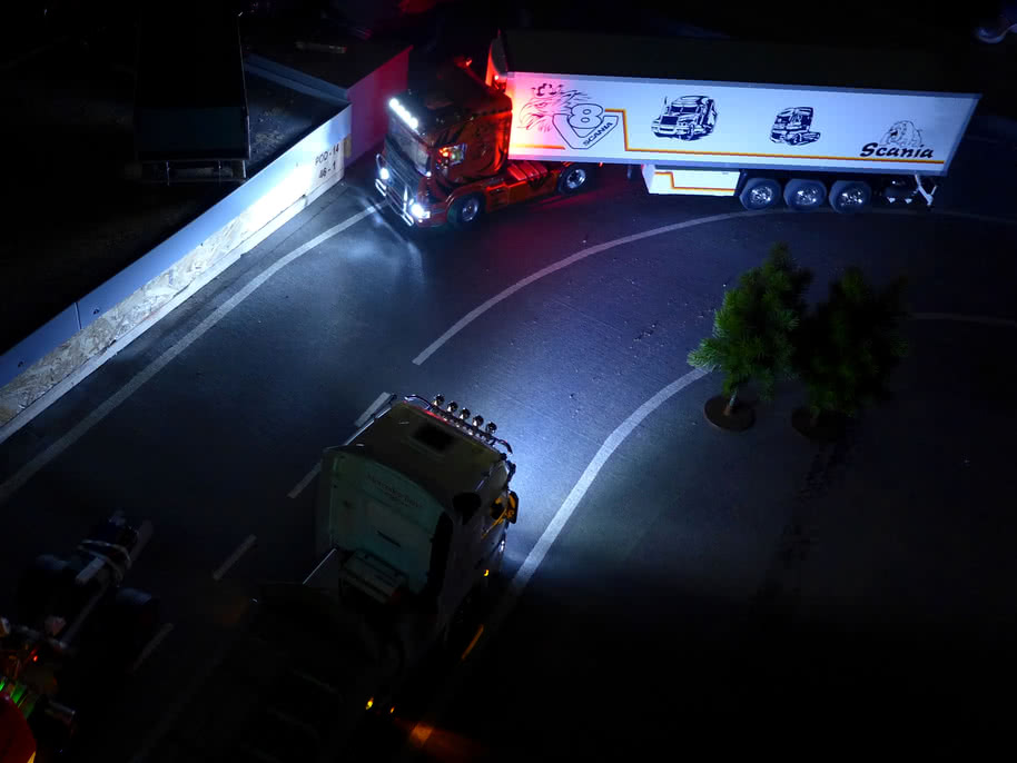 Během dne opět na chvíli zhasla světla v hale – jednou jsem zrovna s Agrovkou odvážel náklad rašeliny a podruhé to bylo těsně po vyproštění Ričiho MANu. Při simulovaných nočních jízdách vynikne propracované osvětlení tahačů. Kolegové modeláři, poznáte své stroje na fotkách podle rozsvícených světel?