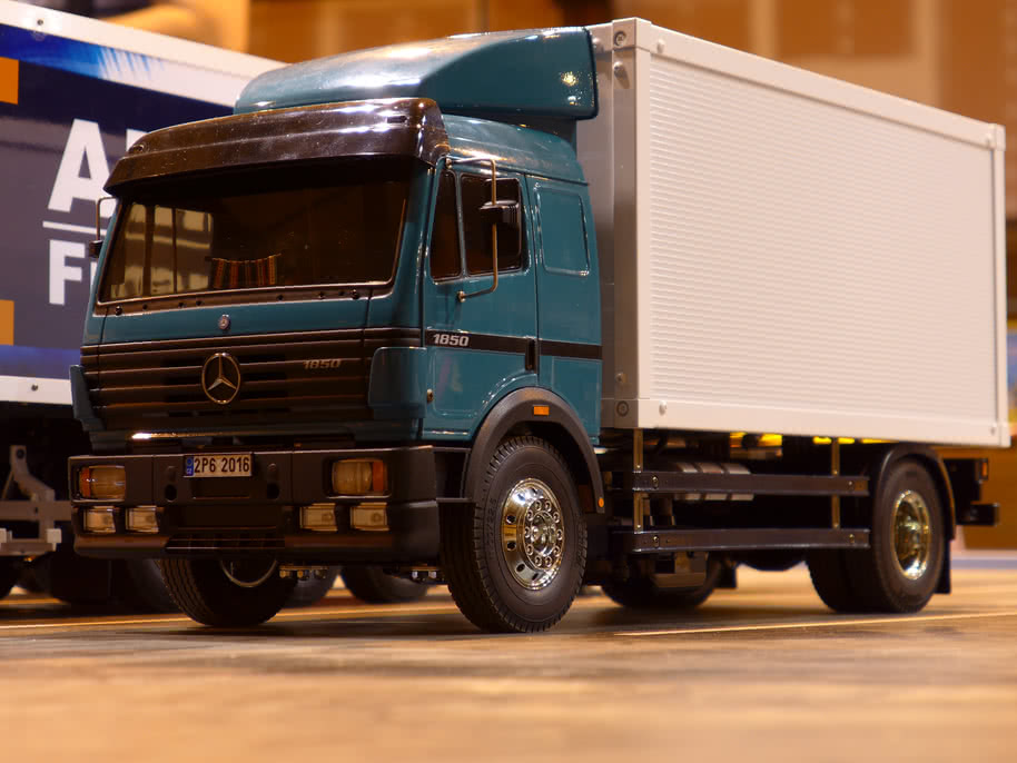 Mezi silničními vozidly byl i tento skříňový nákladní automobil Mercedes Benz 1850. Sice mi přijdou některé silniční náklaďáky ze stavebnic až příliš přechromované a nerealistické, tento kousek mě ale zaujal. Možná tím, že z něj nikde nekoukal nenastříkaný kus hliníku. Celkově na mě auto působilo věrohodným a celistvým dojmem, přestože skříň nástavby byla bez popisů nebo reklamy. Ve stoupání byl sice stejně neschopný jako všechny Mercedesy, ale na fotce vypadá přímo krásně. Na videu je záběr, jak Agrovka naložená dvanácti tunami materiálu vyjede silniční stoupání jako nic, za ní se tento Mercedes pokouší o totéž. Zastaví jej malý schůdek velikosti obrubníku, který nakonec úspěšně překonává s rozjezdem. To prosím v žádném případě nechápejte jako výsměch – naopak, chválím realistické chování vozu!