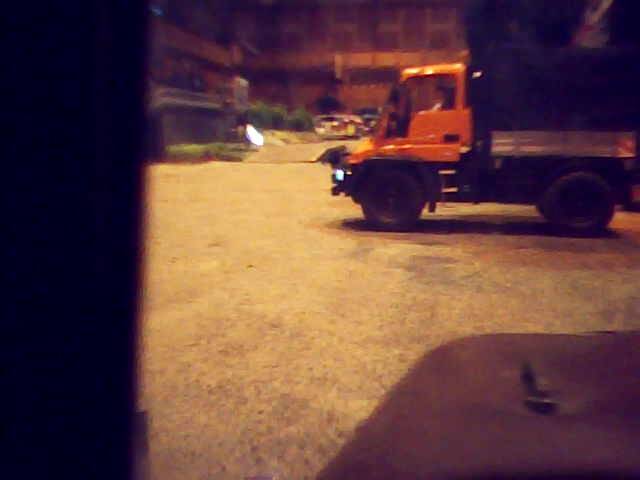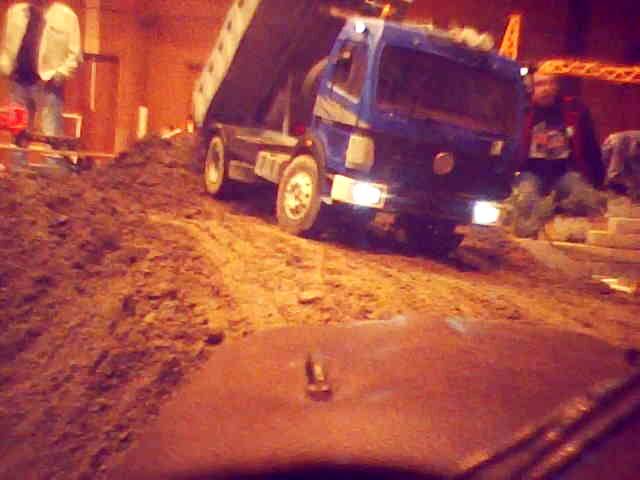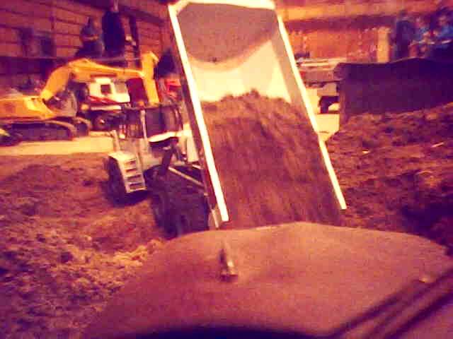 Riči převrátil svou soupravu při vyklápění materiálu. Už když začal zvedat, tak mi bylo jasné, že musím nechat kameru puštěnou a být zticha ;) . Okamžik převrhnutí i celou následnou záchrannou operaci tak máte možnost vidět na videu. Zde bych chtěl vyzdvihnout Ričiho kaskadérskou zručnost – "položil" svou soupravu přesně 1cm od stojící Agrovky.