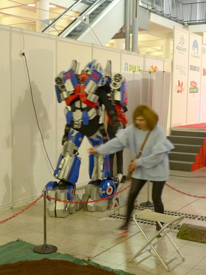 Snad jen sobotní vystoupení Transformers na chvilku vytvořilo nějakou koncentrovanější návštěvnost. Zvláště dětem se jejich vystoupení moc líbilo. Těsně před začátkem vystoupení nám bylo vyčiněno, že jsme si bez dovolení trochu rozšířili ohrazení našeho plácku. Musíme prý nechat uličku mezi stěnou rozdělující výstavní halu napůl a naším už tak omezeným prostorem. Pak prošli dva borci v maketovém obleku Transformers. Pro jistotu jsem varoval kolegu s modelovou železnicí, aby své krásné soupravy přesunul do bezpečí. Borec v robotickém oblečku to měl skutečně těsně a málem na koleje šlápnul.
