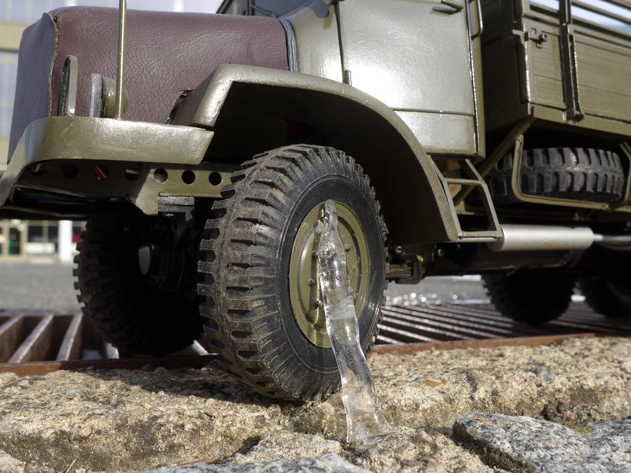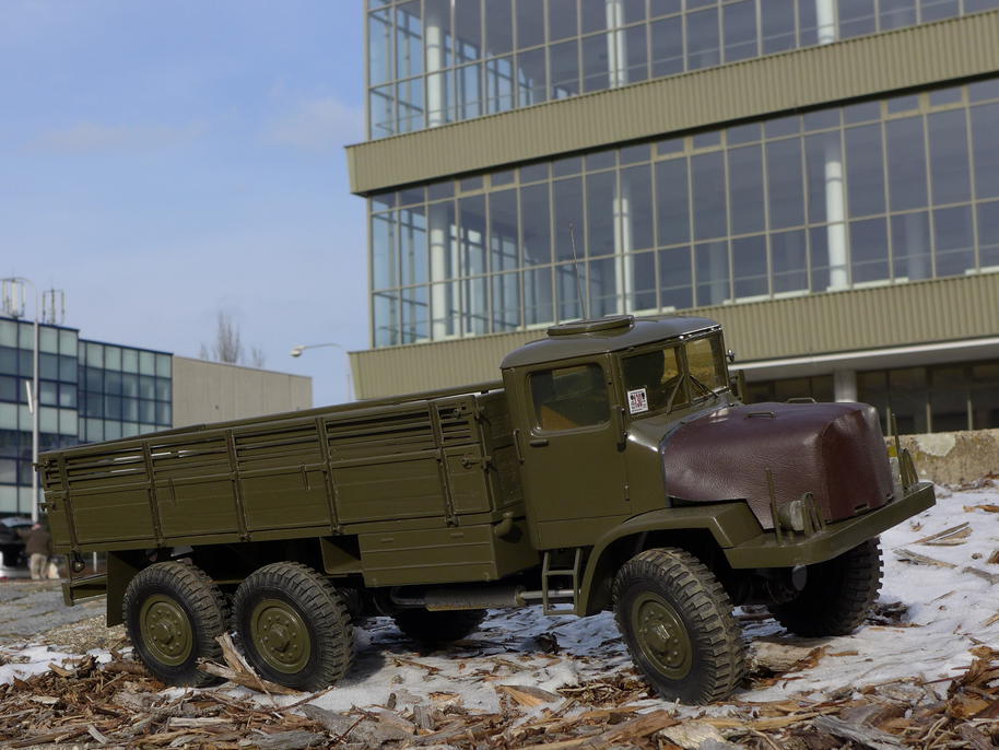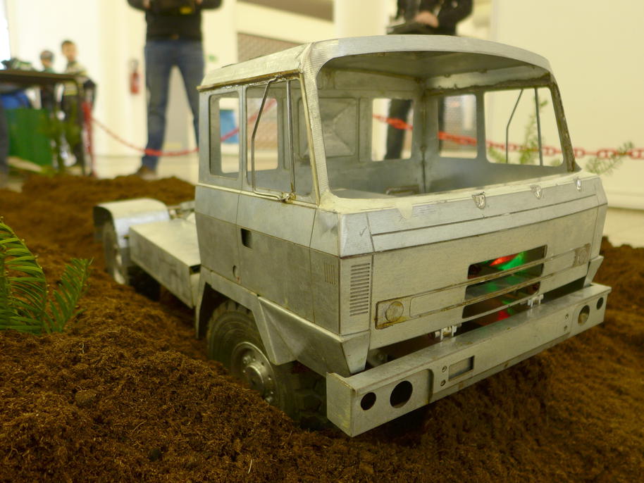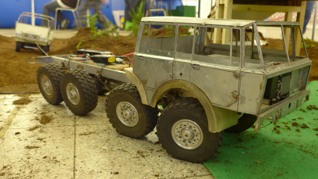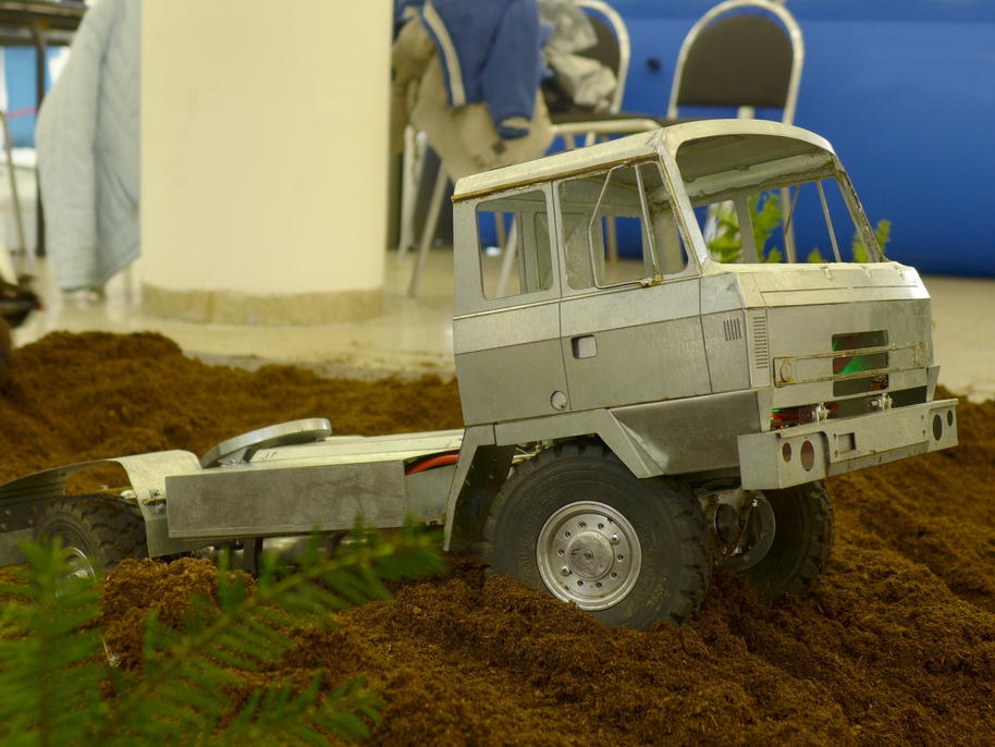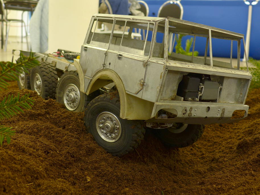 Krásný model Tatry 815 AWS (All Wheel Steering) 4x4x4 přezdívané krab. Přestože model nemá patentovanou Tatrováckou mechanickou převodku řízení mezi oběma nápravami a zatáčení kol obou náprav se děje "po modelářsku" servem, zvládá model všechny jízdní režimy jako skutečná předloha – běžný režim zatáčení pouze přední nápravou, jízdu do boku (obě nápravy mají natočená kola do stejného směru) i režim minimálního průměru otáčení, kdy zadní kola jsou natočena do opačného směru než přední.