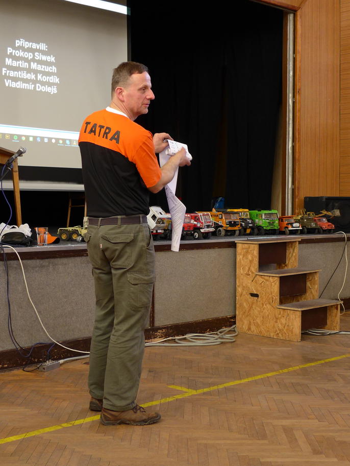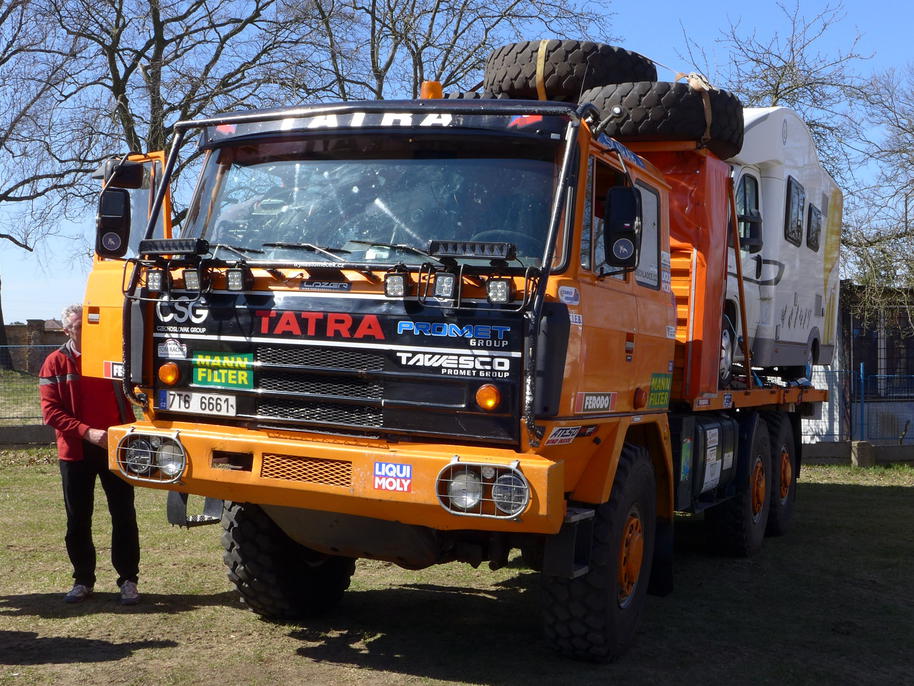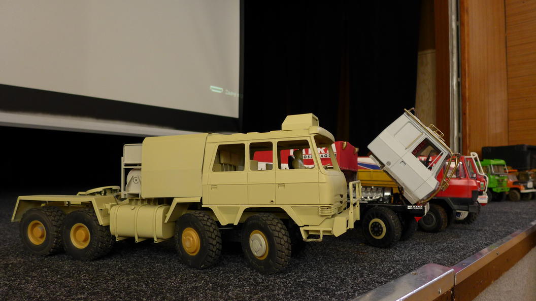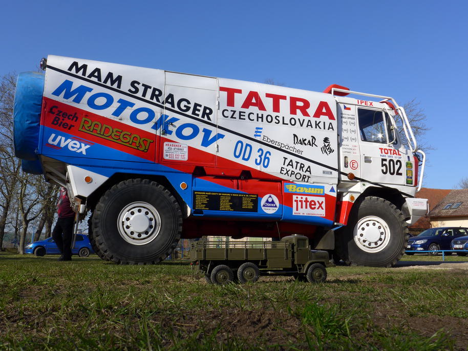 Bylo krásné jarní odpoledne. Před ořešskou sokolovnu se pomalu sjíždějí modeláři. V dáli zaburácí vzduchem chlazená tatrovácká V12 a krátce na to už projíždí branou areálu Milan Horka se svou dakarskou Tatrou 815 4x4. Je vidět, že vůz má v ruce a branou nejede poprvé – rychlý, přesný a efektivní jako vždy :) . Svou bílou krásku parkuje na zeleném trávníku tak, aby se k němu vešly ještě další dva stroje.