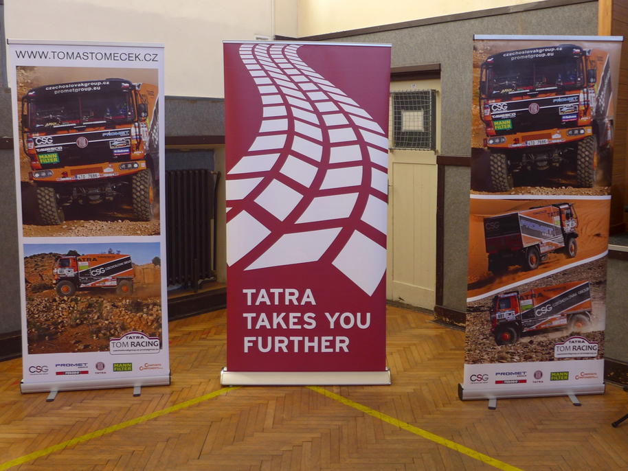 Závodní tým Tomáše Tomečka se skládá typicky ze 4 Tater, přičemž jen jedna je "ostrá" závodní, ostatní jsou doprovodné. Tomáš vyprávěl i o svých počátečních problémech s motocyklovou navigací. Na první etapě se mu roadbook odvíjel příliš rychle, takže jízda byla spíš podle citu :) . V cíli mu pak se správným nastavením pomohli kolegové závodící na jednostopých strojích. Roadbooky pro motocykly a pro kamiony pak Tomáš nechal kolovat. Měli jsme možnost si je detailně prohlédnout a porovnat.