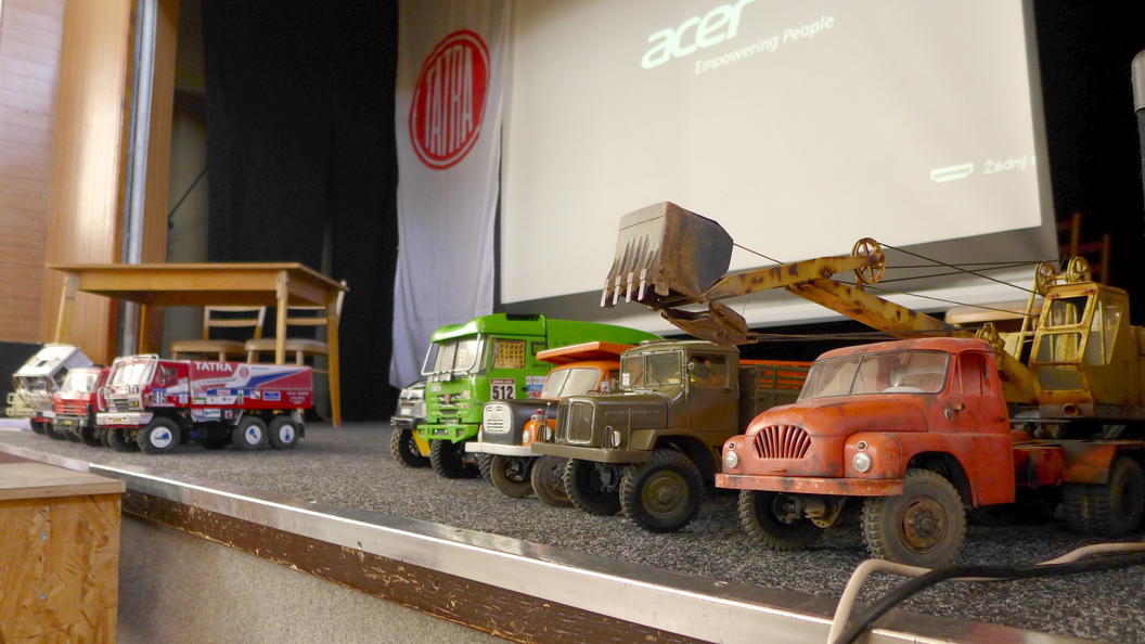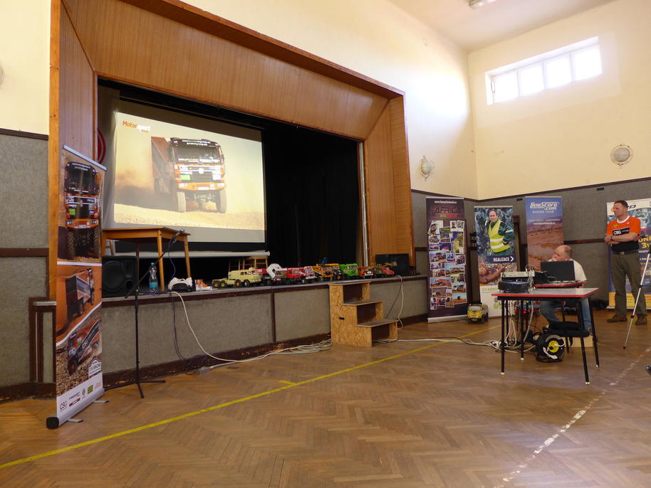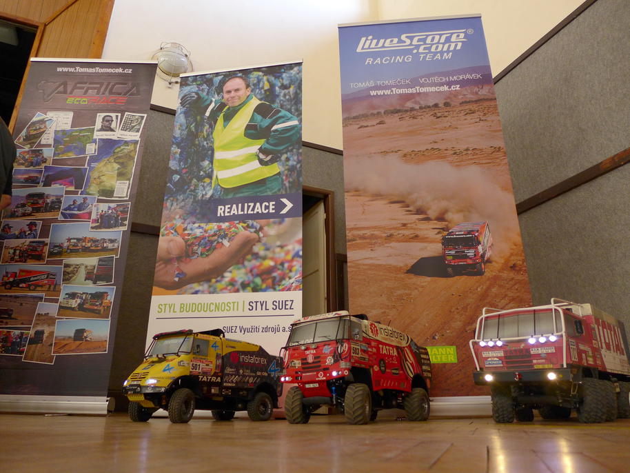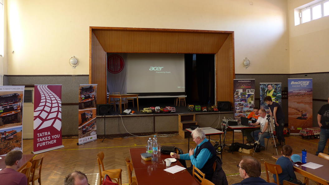 To už je před sokolovnou zaparkována i spousta osobních přibližovadel a nadšení diváci očekávají zahájení besedy. Beseda začala krátkým úvodem, Tomáš Tomeček využil modelů vyskládaných na pódiu k uvedení svého prvního videa – modely byly totiž také přítomny startu letošního Africa ECO Race. Mezi modely na pódiu se po 10 letech na veřejnosti objevila i LIWA ... naposledy jsme ji měli možnost vidět v pohybu v Kolíně 2008 .