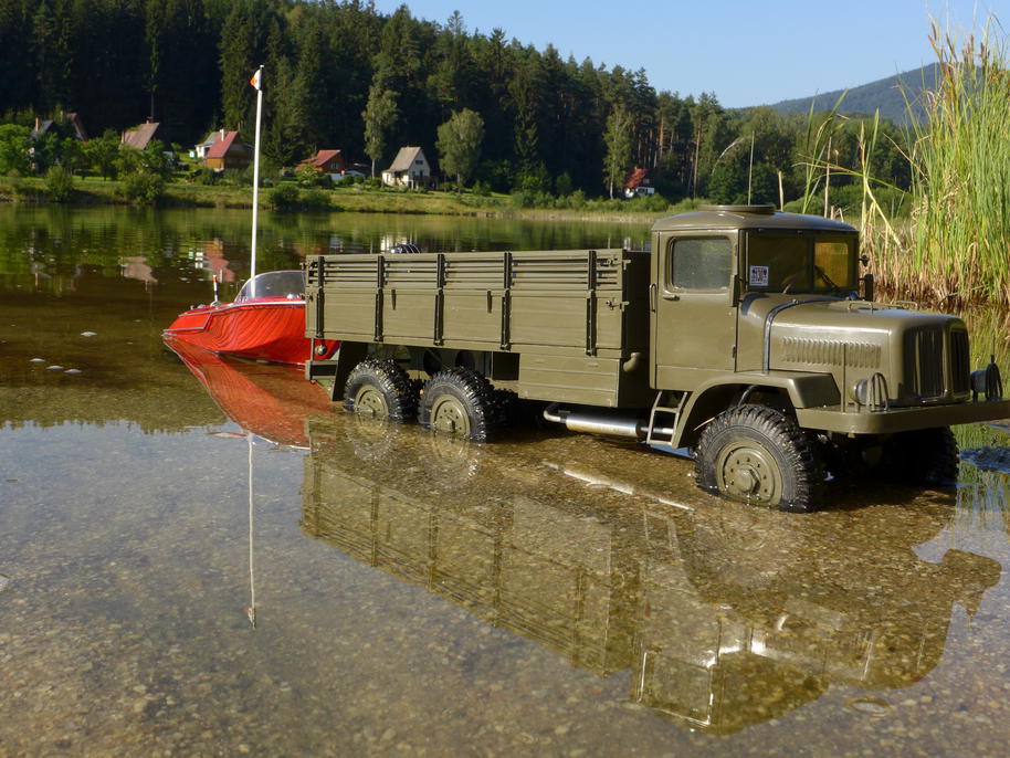Řidič Tatry ale prokázal své zkušenosti, upravil výjezd na břeh tak, aby přední kola neztratila záběr a nakonec Tatra dokázala člun úspěšně doslova "vyrvat" na břeh.