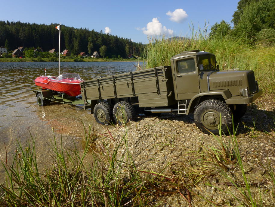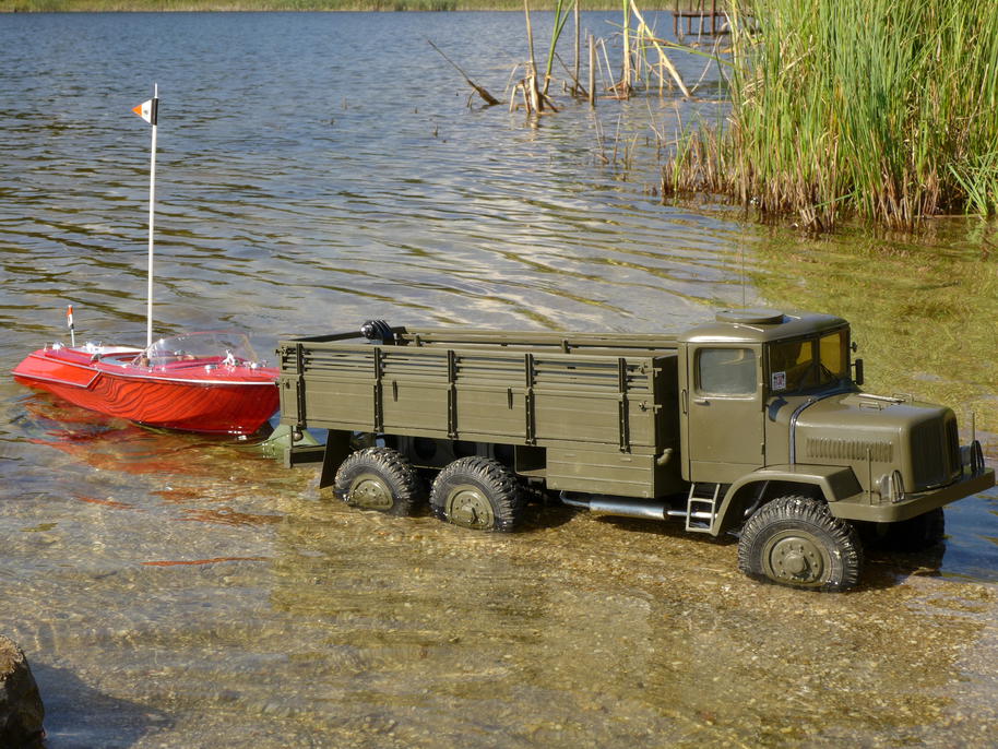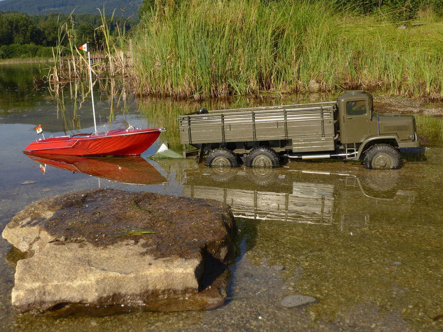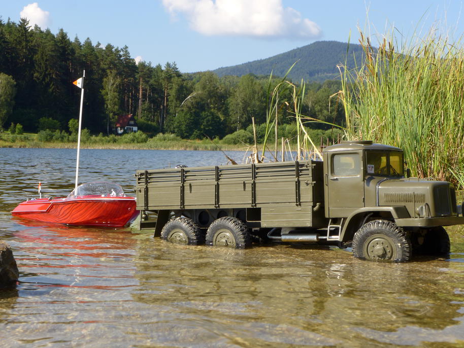 Přesně jak jsem předpokládal, mokrý písek pod hladinou je zrádný. Tatra sice bez problémů zvládla vytáhnout prázdný přívěs na břeh, s člunem to už ale bylo horší. Na břeh jsme se "hrabali" skoro půl hodiny. Klíčovým problémem byly travní drny těsně u hladiny. Tatra si "úspěšně" vyhrabala v písku díry a na drny už se často vyškrábat nedokázala. Koncentrace lidí na pláži se zvyšovala a s tím narůstala i naše nervozita. Modely samozřejme přitahovaly zájemce a pořídit záznam bez pokřiku v pozadí bylo stále obtížnější.