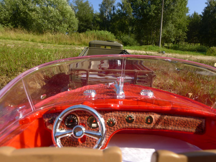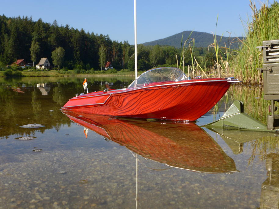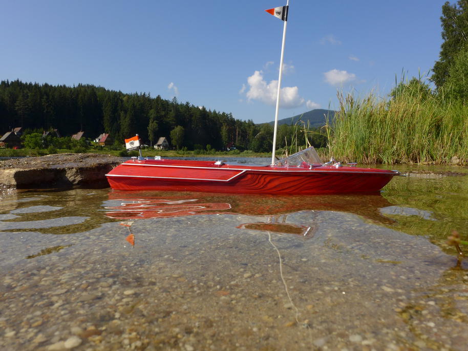 Při pohledu zvenku ranní sluníčko krásně osvětlovalo gejzíry vody od přídě plujícího člunu. V některých pasážích vypadá člun jako racek připravující se ke vzletu těsně nad vodní hladinou. Mimochodem – při záběrech zvenku člun obratně pilotuje má krásná paní. S ovládáním modelu se bez problémů sžila asi během minuty a pak už mi člun nechtěla vrátit ;) .