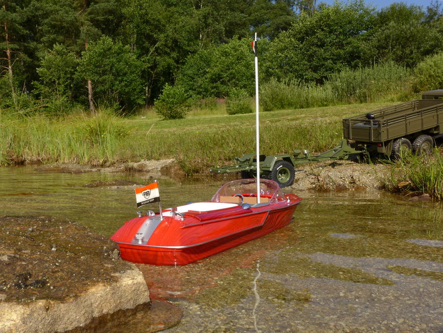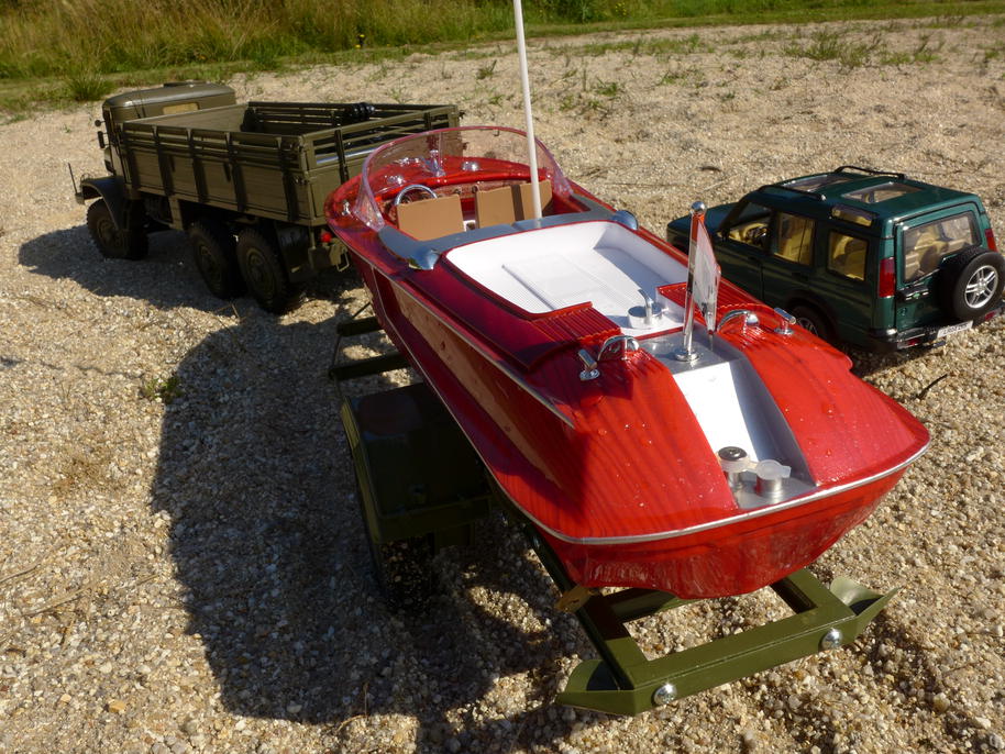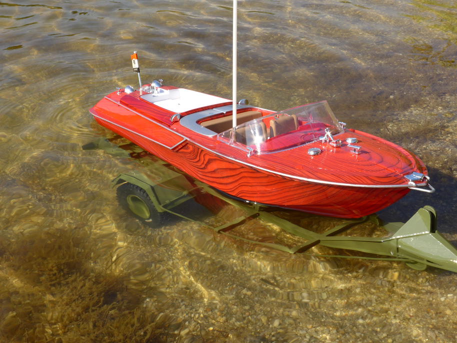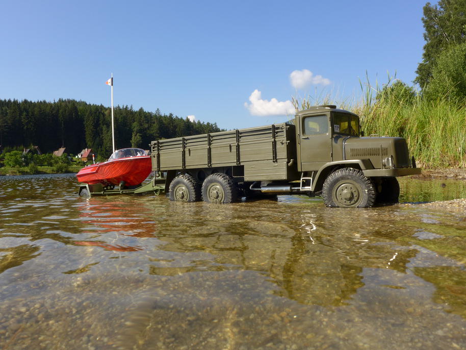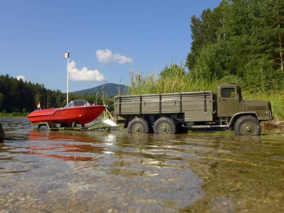 Přívěs se pomalu noří do vody, až pod hladinou zmizí úplně a člun se odpoutá od podvozku. Několik záběrů na záběr lodních šroubů a už následuje plavba po zcela klidné hladině vodní nádrže.