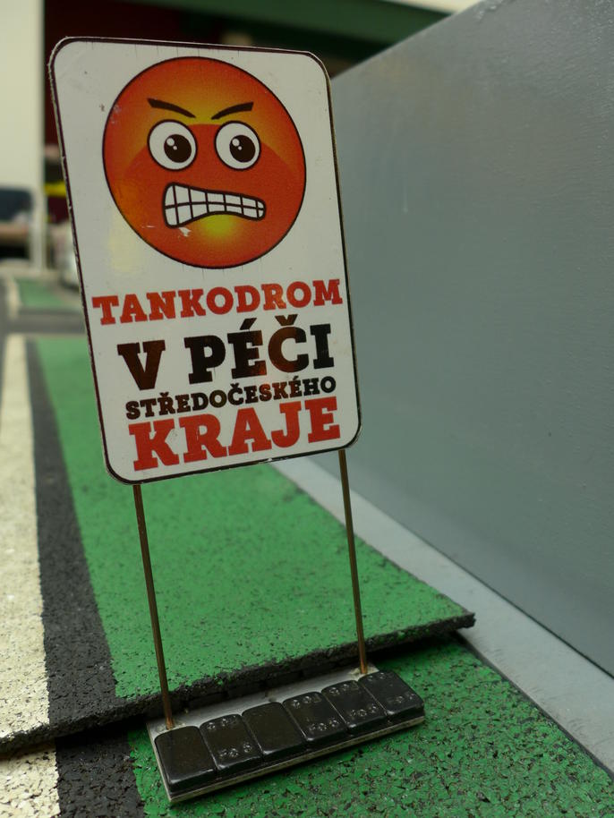 Velmi trefná cedule: Tankodrom v "péči" Středočeského kraje. To mohu ze své zkušenosti jen potvrdit, některé cesty (zdráhám se napsat silnice) ve Středočeském kraji skutečně vyžadují off-road vozidlo. Zde na akci Tatra nerovnosti na silnici v podstatě nevnímala, nebylo tu nic, co by pro nás bylo nesjízdné. Ostatně Tatře nevadí ani půlmetrový schod :) . Ale je fakt, že některé silniční tahače měly s příčnými nerovnostmi problém a občas vyžadovaly pomoc dalších vozidel. Dojem tankodromu skvěle dotvářel válec na kompresi rašeliny pohybující-se po asfaltové silnici ... možná se snažil rozbít zbytky asfaltu a aspoň trochu cestu zhutnit :) .