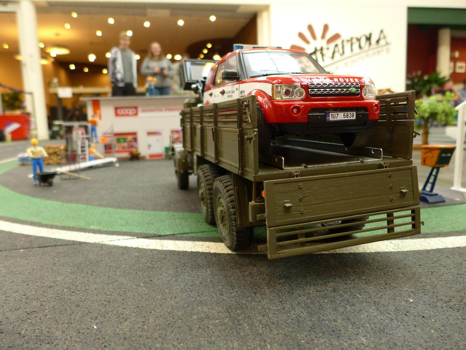 Vedle Pínovy hasičárny stála majestátní T815-7 6x6 v měřítku 1:10. Přes silnici, před právě rekonstruovanou prodejnou Jednota COOP Pínovice, stál další stroj hasičského sboru – Land Rover Discovery 4. A proč Tatra opakovaně na akcích vozí na korbě různé Land Rovery? Aby se situace někdy obrátila ;) .