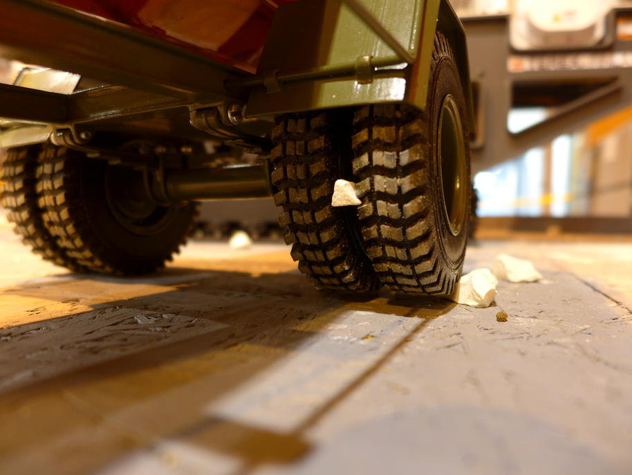 Do Domažlic jsem vzal kromě obou Tater také přívěs s lodí. Podařilo se jej šetrně uložit na Agrovku, čímž odpadla třetí přepravní krabice ;) . Od kolegy jsem obdržel hned ráno zbývající bižuterii a také finální odlitky pneumatik, které jsem na přívěs ihned namontoval. Někdo připomínkoval terénní vzorek na přívěsu, ale já jej naopak vítám. Aspoň přívěs nebude v terénu klouzat. Tupláky mají jednu provozně nebezpečnou vlastnost – je možné mezi pneumatiky zarazit opravdu velké kameny :) . Naštěstí to při jízdě nevyletělo...