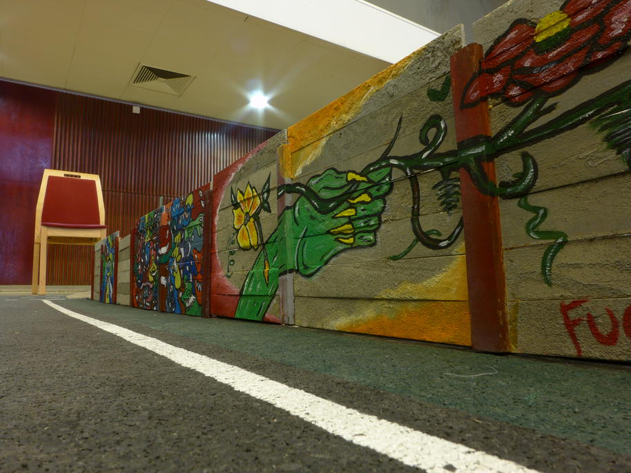 V sále bylo velmi málo světla, časy otevření závěrky foťáku se povážlivě blížily k desetině sekundy. To umožnilo zajímavé efekty s velkým zacloněním a dlouhým časem ... přirozeně na stativu. Než se tedy všichni rozjeli, obcházel jsem postupně vznikající expozice a pořizoval fotky modelových detailů. Významnou část modelové expozice zabíraly Kelvinovy stavebniny s množstvím krásných detailů. Nově měly některé části zdí zvenku ozdobeny originálními barevnými grafiti.