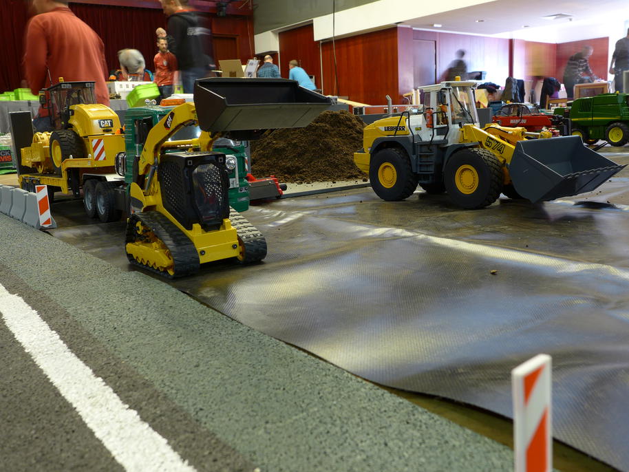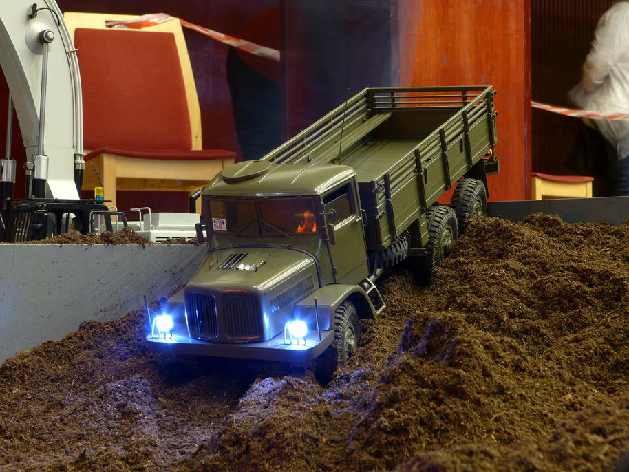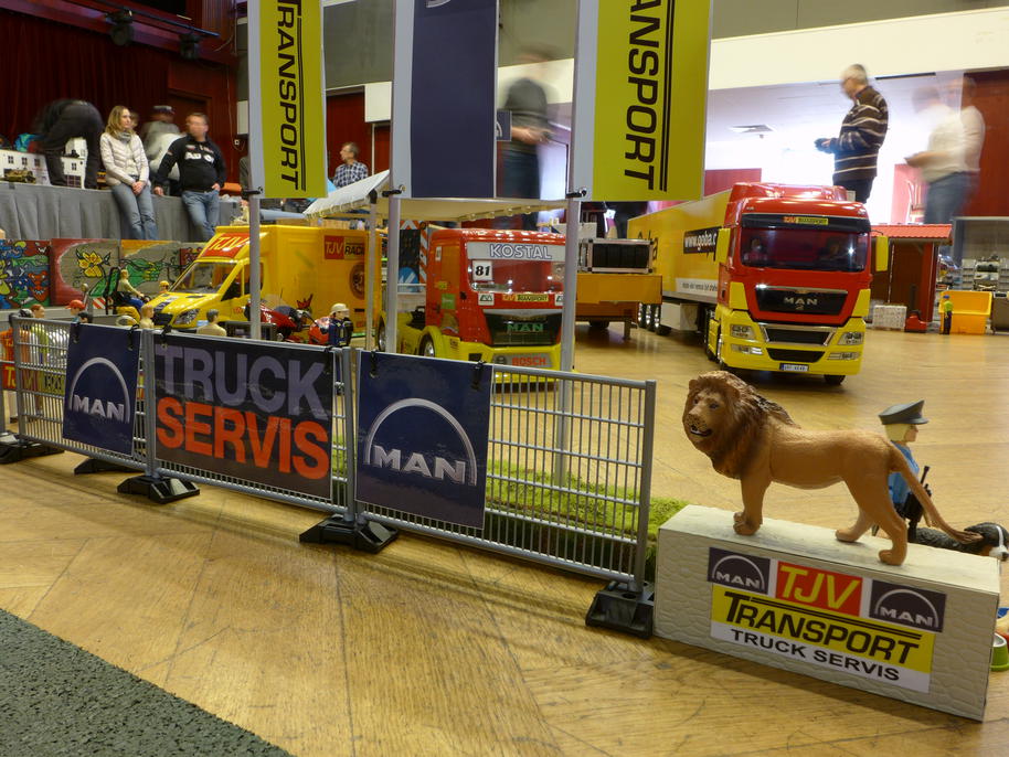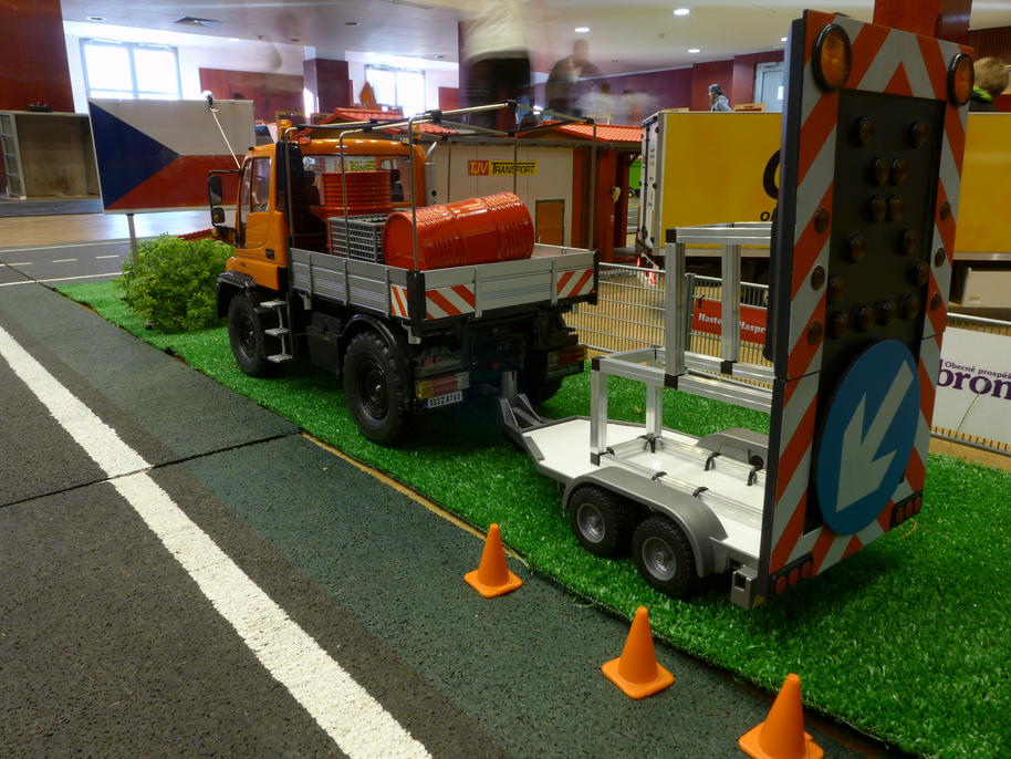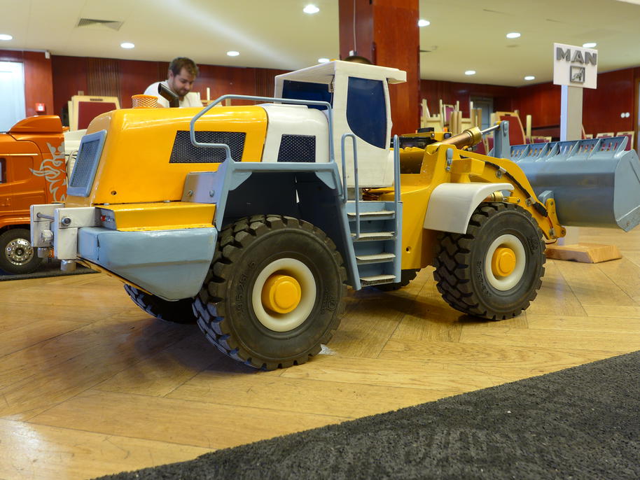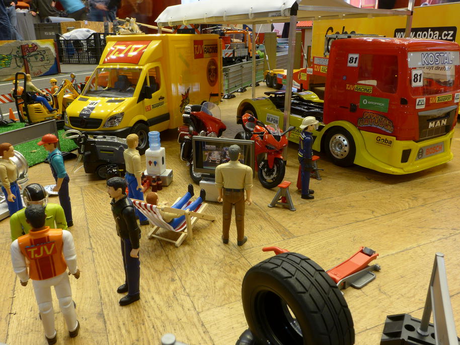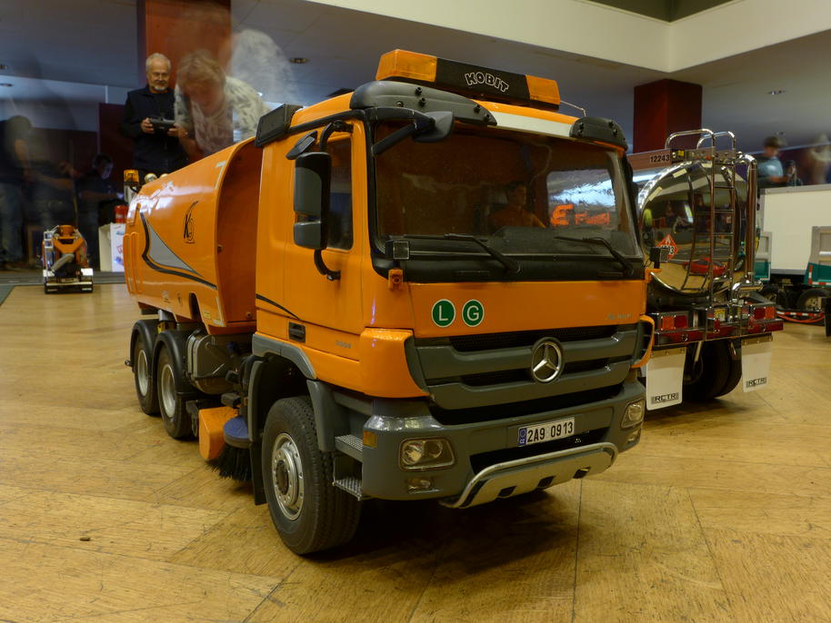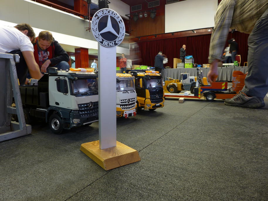 Stánek Mercedes Benz s množstvím nových nákladních automobilů a sousední modelové staveniště, kterému dominoval velký nakladač postavený částečně s pomocí 3D tisku. Ostatně 3D tisk se rozmáhá stále více i v modelovém prostředí – přepravovaný materiál i slečna sedící na traileru byly také vytvořeny metodou 3D tisku.