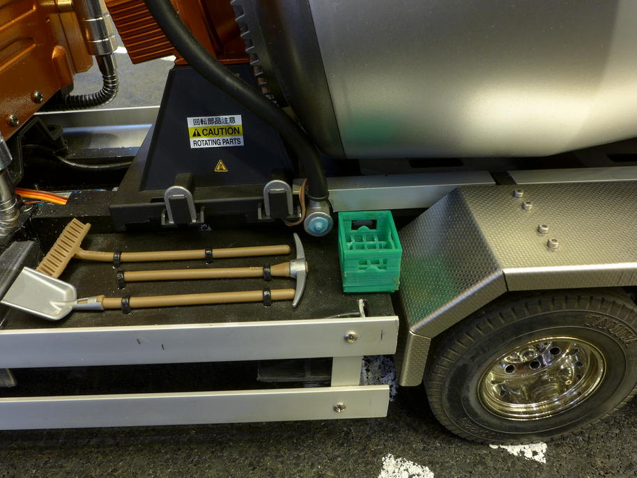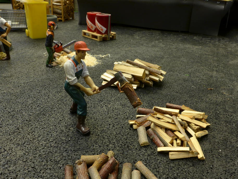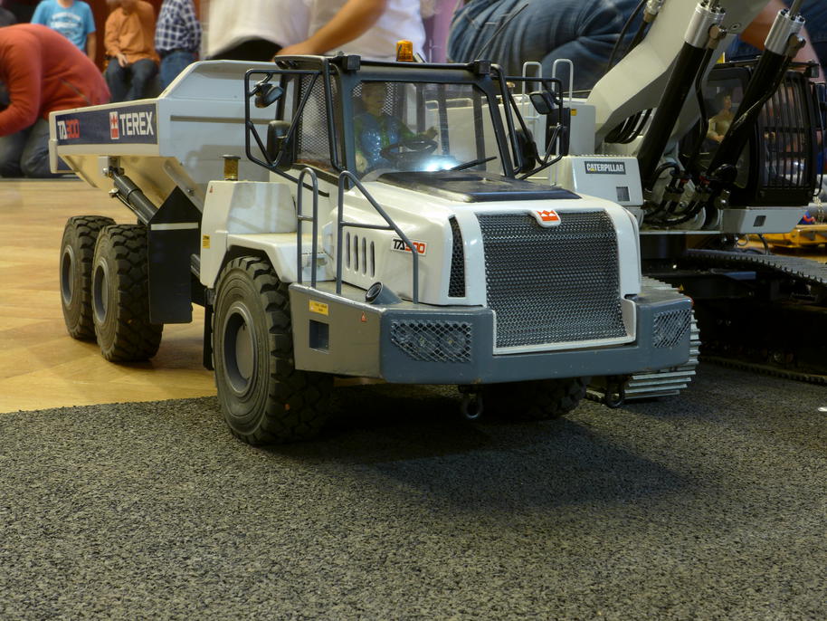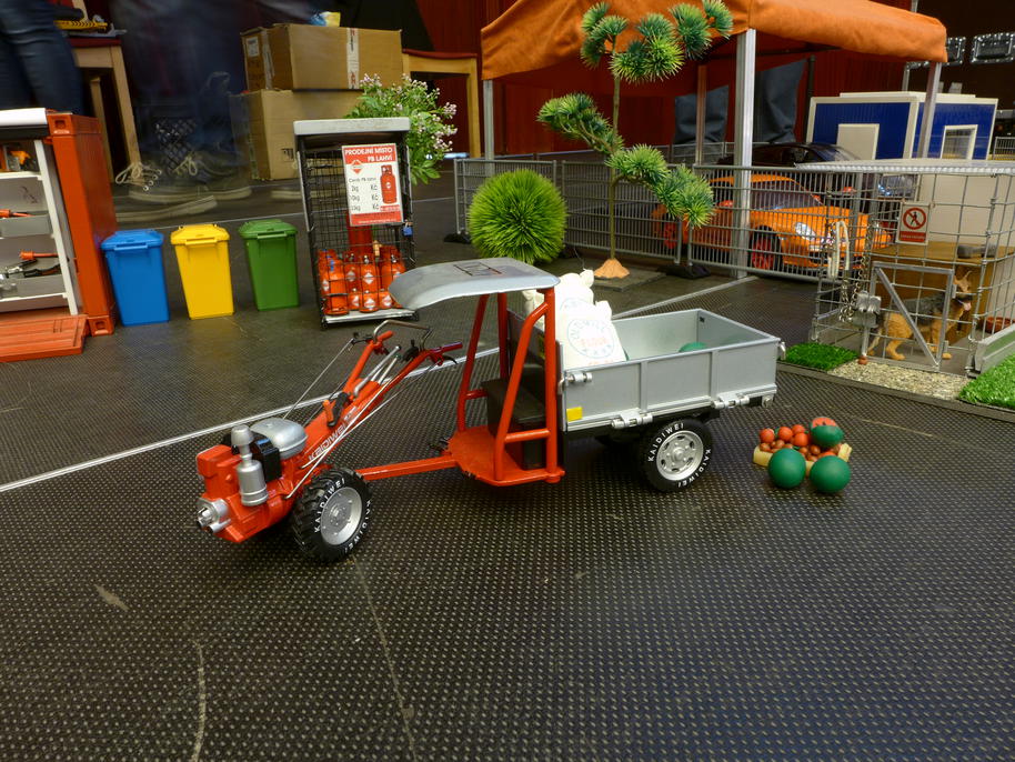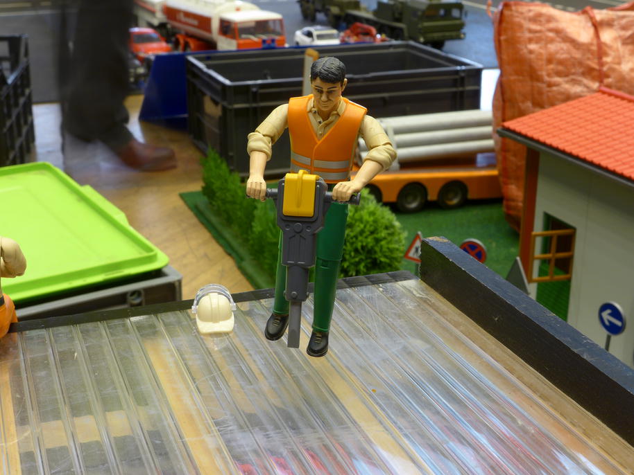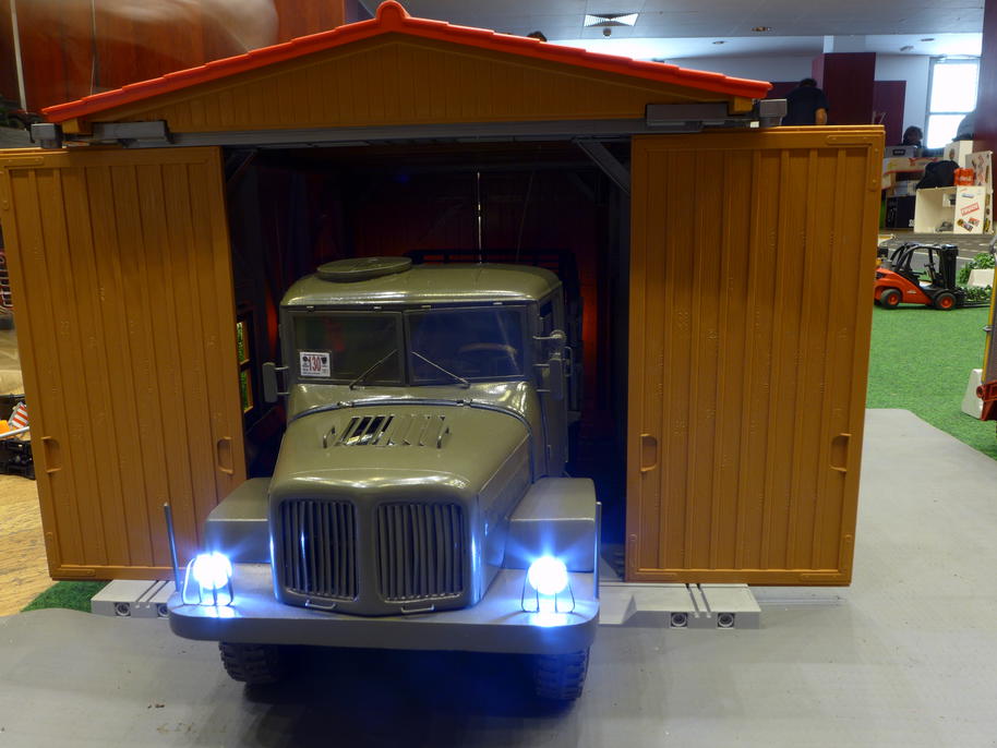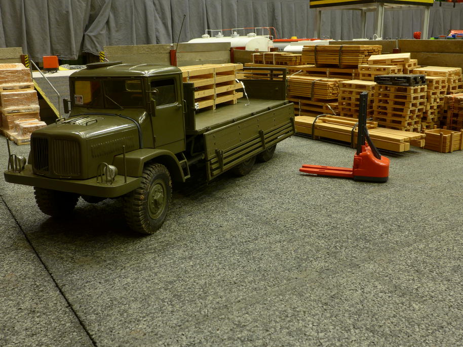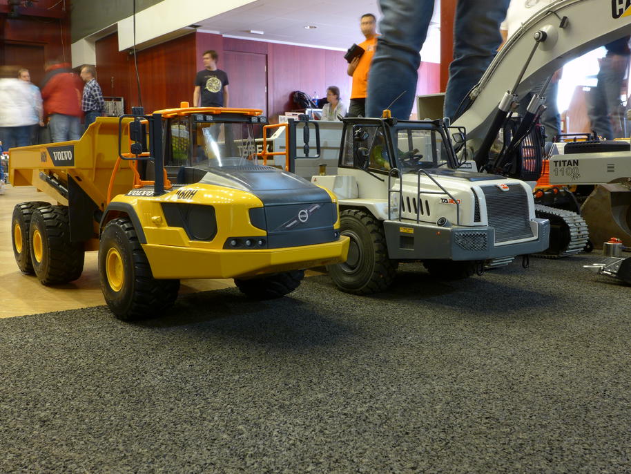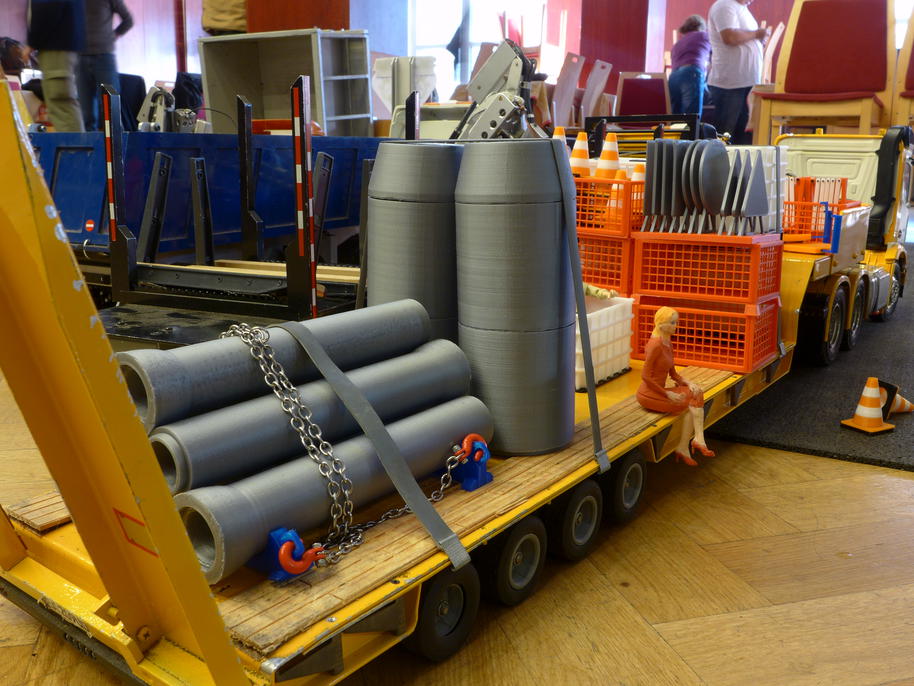 Stánek Mercedes Benz s množstvím nových nákladních automobilů a sousední modelové staveniště, kterému dominoval velký nakladač postavený částečně s pomocí 3D tisku. Ostatně 3D tisk se rozmáhá stále více i v modelovém prostředí – přepravovaný materiál i slečna sedící na traileru byly také vytvořeny metodou 3D tisku.