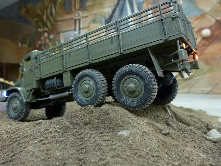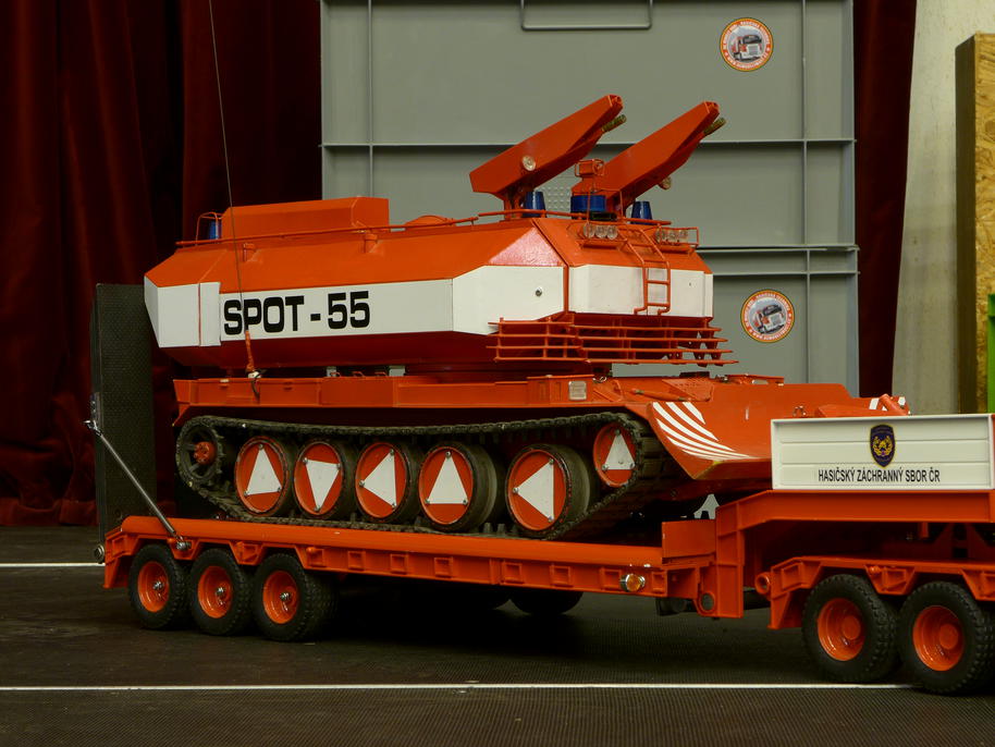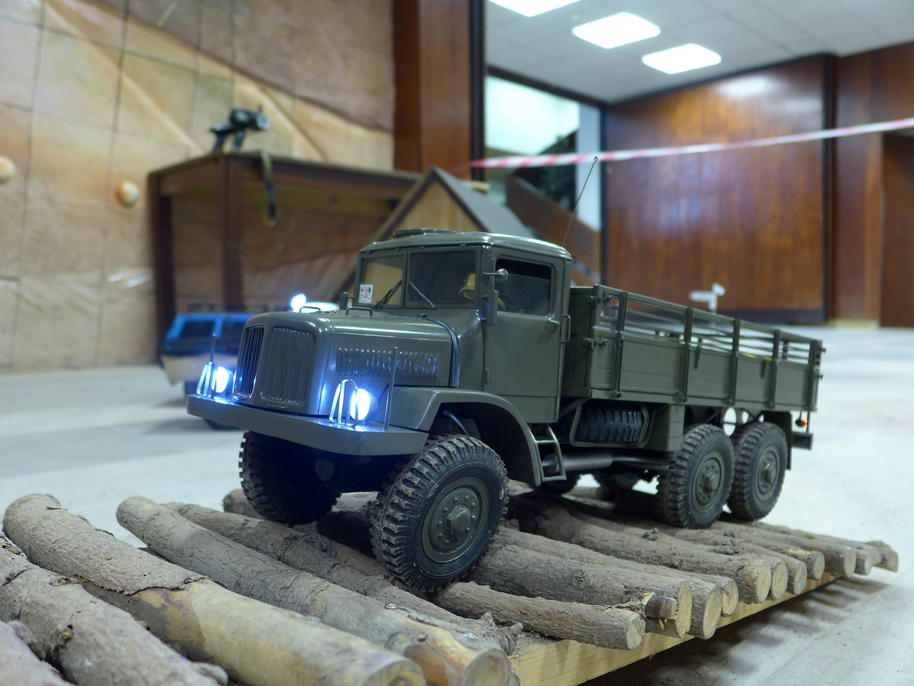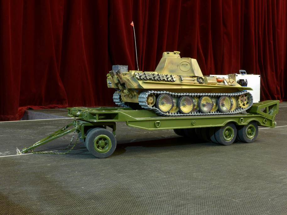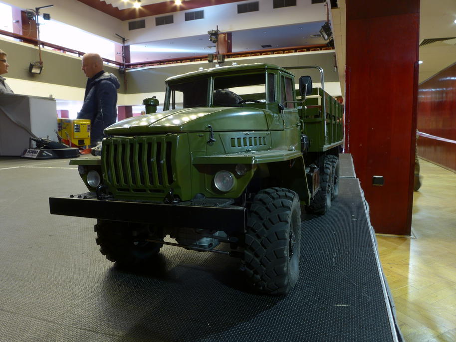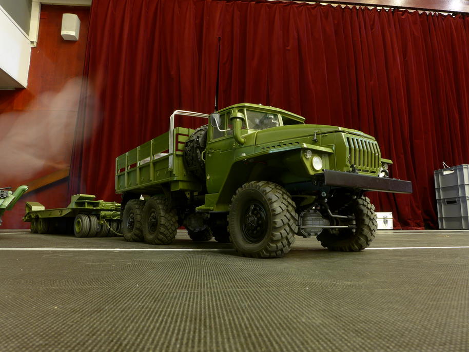 Mezi tanky stál i velice zajímavý model ruského Uralu (měřítko 1:12?). Táhl za sebou podvalník P32 a na něm německý Panther ... Zde je jasně vidět kvalita výrobků státního podniku Transporta Chrudim. Podvalník s deklarovanou nosností 32 tun bez problémů uveze 45 tun těžkého Panthera :) .