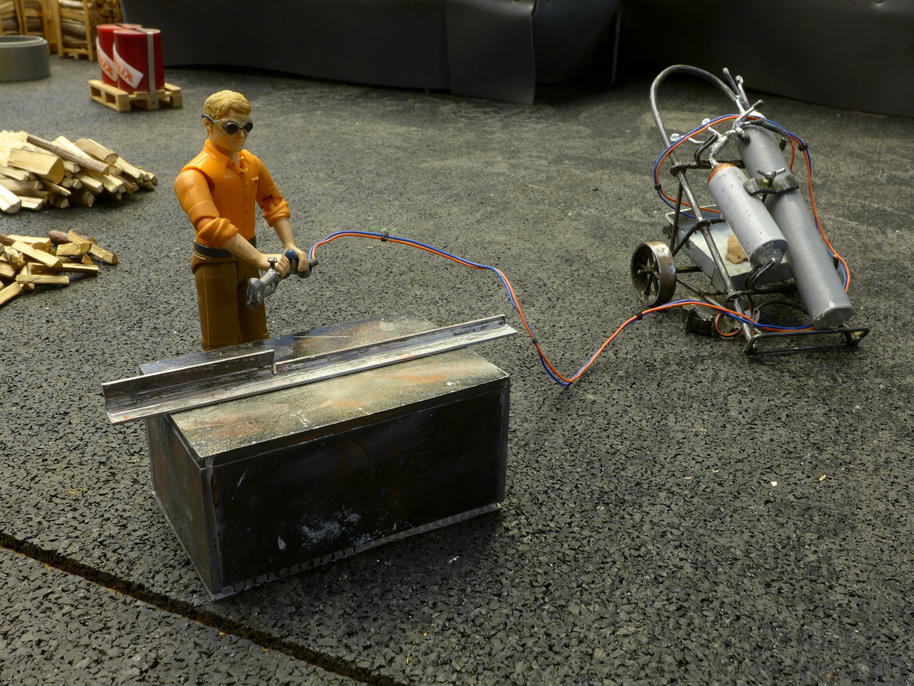 Ale co dělá borec se sbíječkou na skleněné střeše čerpací stanice? Jeho kámoši posedávají, klábosí a do práce se moc nehrnou.