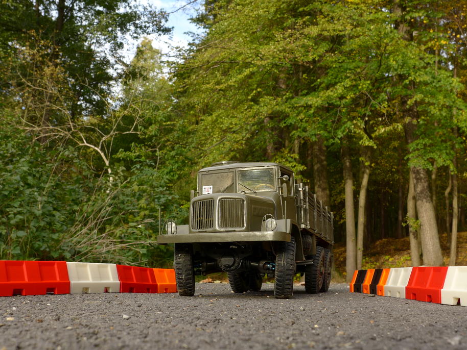 Mělký brod se zurčící vodou. Cestou dolů k brodu se ukázalo, že Tatra už na dvojku nebrzdí převody ani na relativně pozvolném svahu (cca 10% sklon). Musel jsem ji zastavit "ručně" – poučení pro příště, včas dát jedničku v mechanické převodovce. Nikdy dříve takto jemně nejezdila...