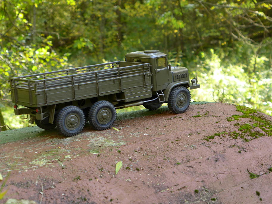 Pěkně opravených řopíků v našem okolí moc není, tento se skrývá nedaleko silnice ve svahu obklopen hustým porostem. U řopíku je posed a pod ním takový dřevěný stoleček jako stvořený pro naaranžování naší Tatry. Přeci jen v trávě nevypadala moc realisticky.