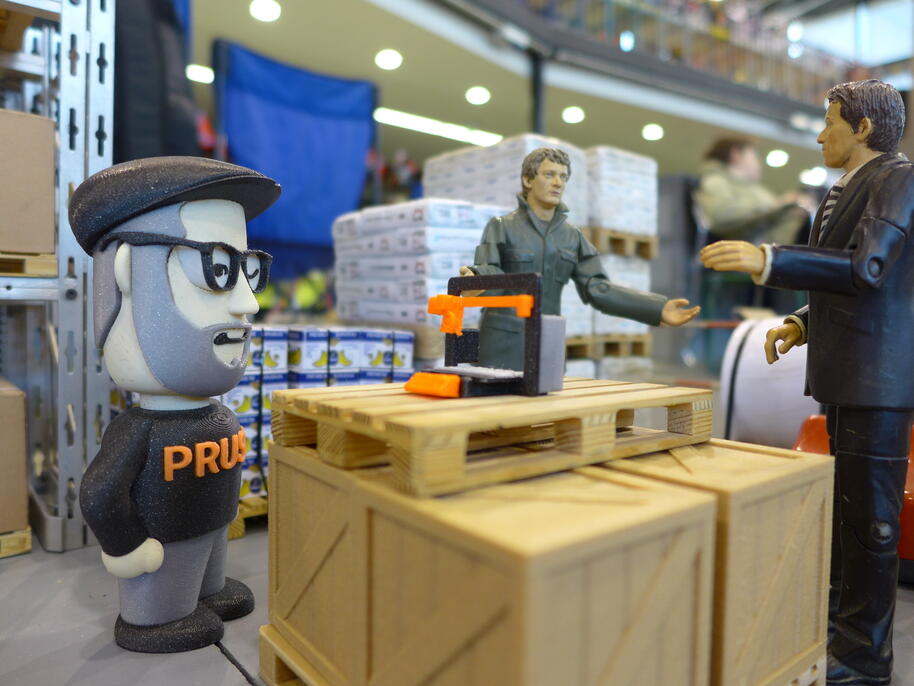 Drobnou komplikací bylo, že naložená Tatra urputně odmítala zatáčet. Zadní nápravy se zakusovaly do modelového asfaltu a už tak omezený rejd předních kol a uzavřené zadní diferenciály dělaly manévrování značně nesnadné. 90° zatáčky jsem stěží vybíral od jednoho obrubníku ke druhému a otočit se na most z protisměru bylo prakticky vyloučeno. Proto jsem brzy vrchní řadu beden sňal a demonstrativně je vyskládal na rampu skladu stavebního materiálu. Jednu bednu jsem otevřel a tiskárnu postavil na jinou bednu vedle. Majkl k ní pak naaranžoval Pepu a dva modelové pracovníky skladu, kteří vypadali, jako kdyby se zrovna dohadovali o naší horké novince Original Prusa MK4 (v době konání akce jsem to ještě nesměl prozradit ;) ). Nakládání palet s tiskárnami na Tatru jsme zatím nerealizovali, musím vymyslet, jak bedny na palety správně přichytit.