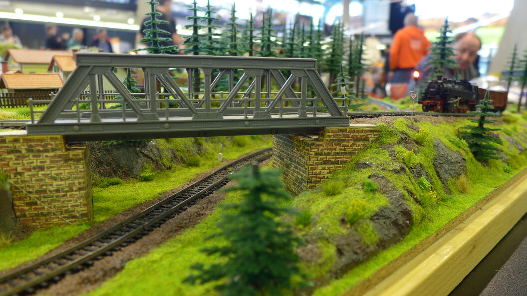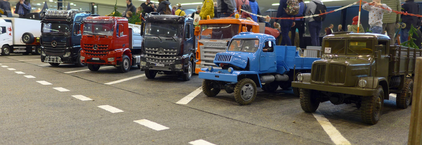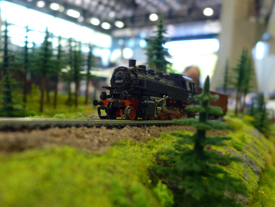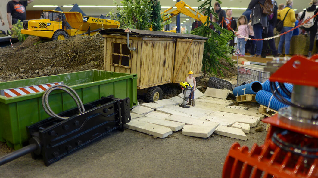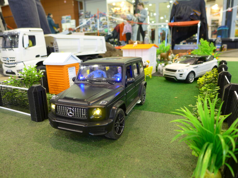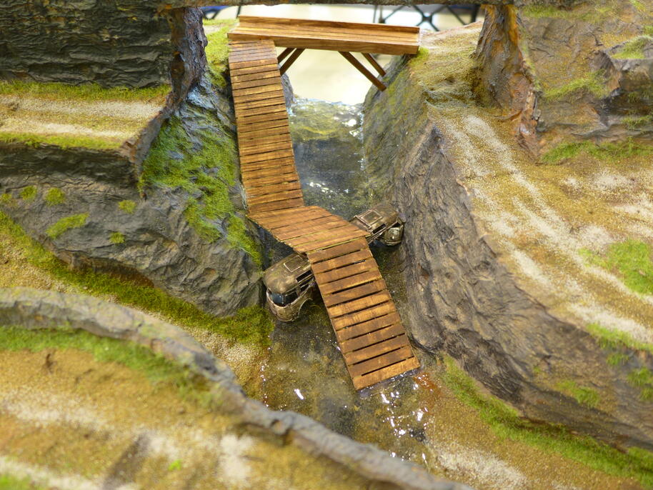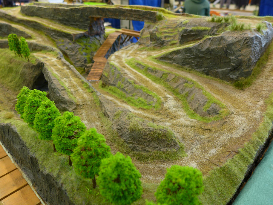 Hned vedle bylo něco podobného – malé terénní RC modely jsem na živo viděl poprvé. Sice při jízdě trochu nepřirozeně poskakovaly, ale jinak zaslouží velký obdiv, jak se do tak malého tělíčka vměstná přijímač, motor, převody a hlavně baterie. Ovšem modely samotné nebyly tím, co činilo tuto prezentaci výjimečnou – tím byl skvostný modelový terén! Působil zároveň promyšleně i uvěřitelně. Byl tvořen skalnatým útvarem s obřím obloukem a několika mostními konstrukcemi přes hluboký kráter s poklidnou mělkou říčkou uprostřed. Téměř celý byl pokryt terasovitými cestičkami nabízejícími bezpočet různých průjezdů. Cestičky byly vysypány jemným pískem a modelovou travou. V dolní části rostlo okolo cestiček i několik stromků. V údolí řeky byl ponechán svému osudu vrak autobusu. Přes něj vedla zvláštní dřevěná lávka umocňující dynamický charakter celého prostoru. Tak malé pohybující-se objekty nenatáčím často a tak jsem měl trochu obavy, zda dokáži s kamerou modely sledovat tak, aby video ve finále nebyla jen jedna rozmazaná plocha. I přes nízkou úroveň osvětlení v hale si ale myslím, že kamera zvládla zaznamenat i tuto expozici se ctí.