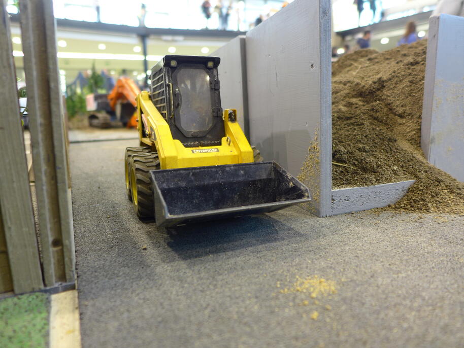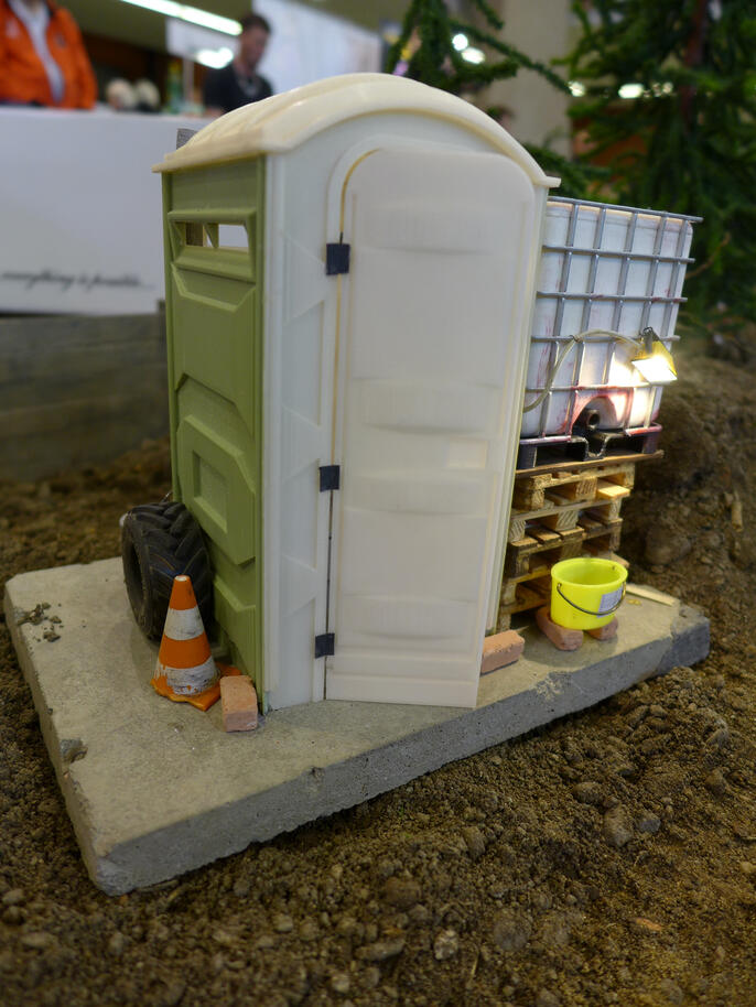 Když jsem se pozdravil se všemi známými tvářemi, chvilku jsem se kochal modelovým terénem, jehož plocha oproti předchozím ročníkům opět narostla v obou směrech. Základ tvořila silniční síť s velkým mostem a na ostrůvcích mezi silnicemi bylo značné množství zeminy a písku, které doplňovalo množství detailů a rekvizit. Všechno působilo uvěřitelně a měl jsem radost, že se tu objevily i rekvizity, na jejichž výrobě jsem se podílel. Dopravní svodidla se evidentně ujaly pouze v červeno-bílém provedení, oranžovo-černý Průša-style asi zůstal někde v krabici. Kadibudky se naopak objevily skoro ve všech barevných variantách, které jsem tiskl. Team, který modelový terén připravil, zasluhuje velkou pochvalu, to muselo dát obrovské množství práce. Už jenom všechen ten materiál do haly dostat – opravdu, klobouk dolů.